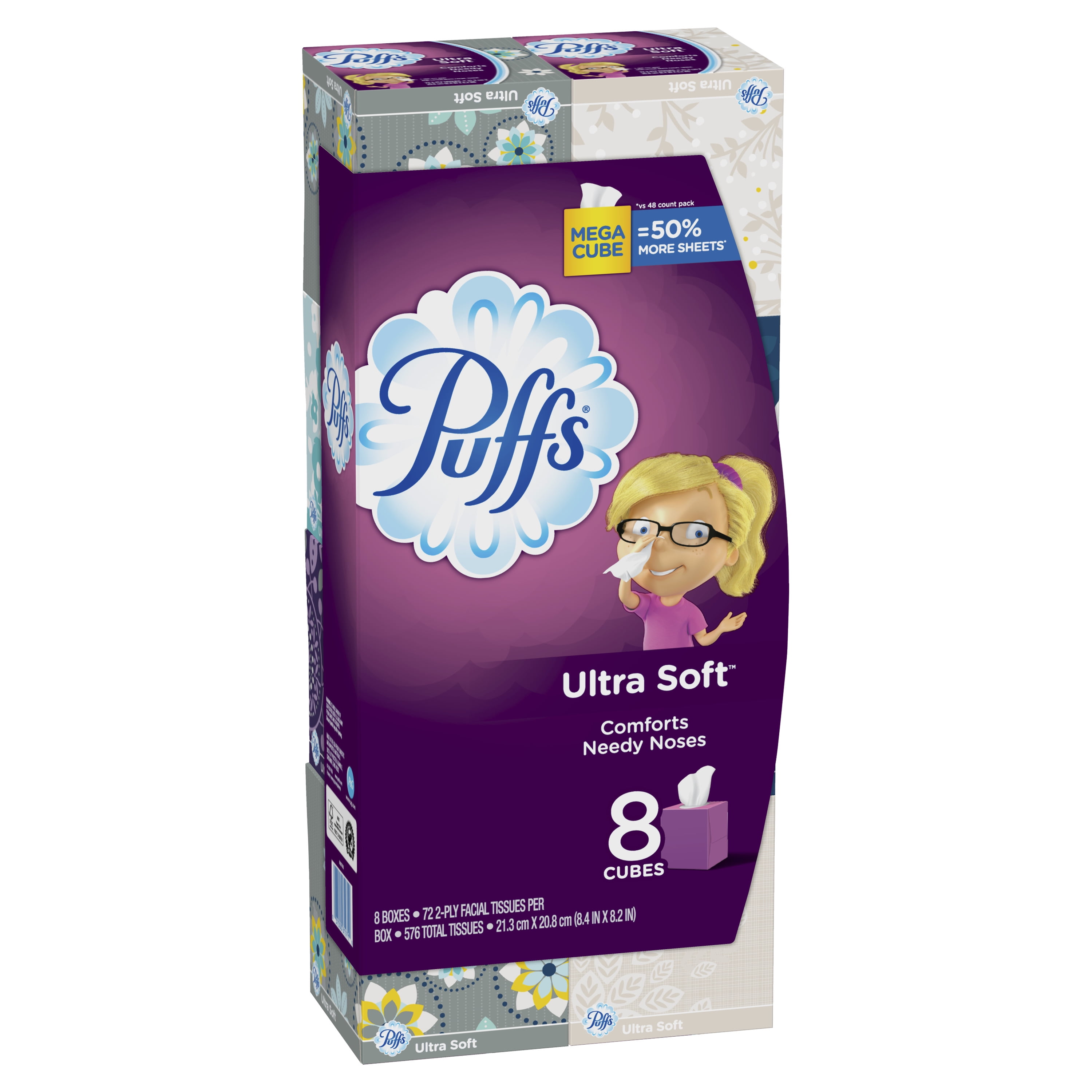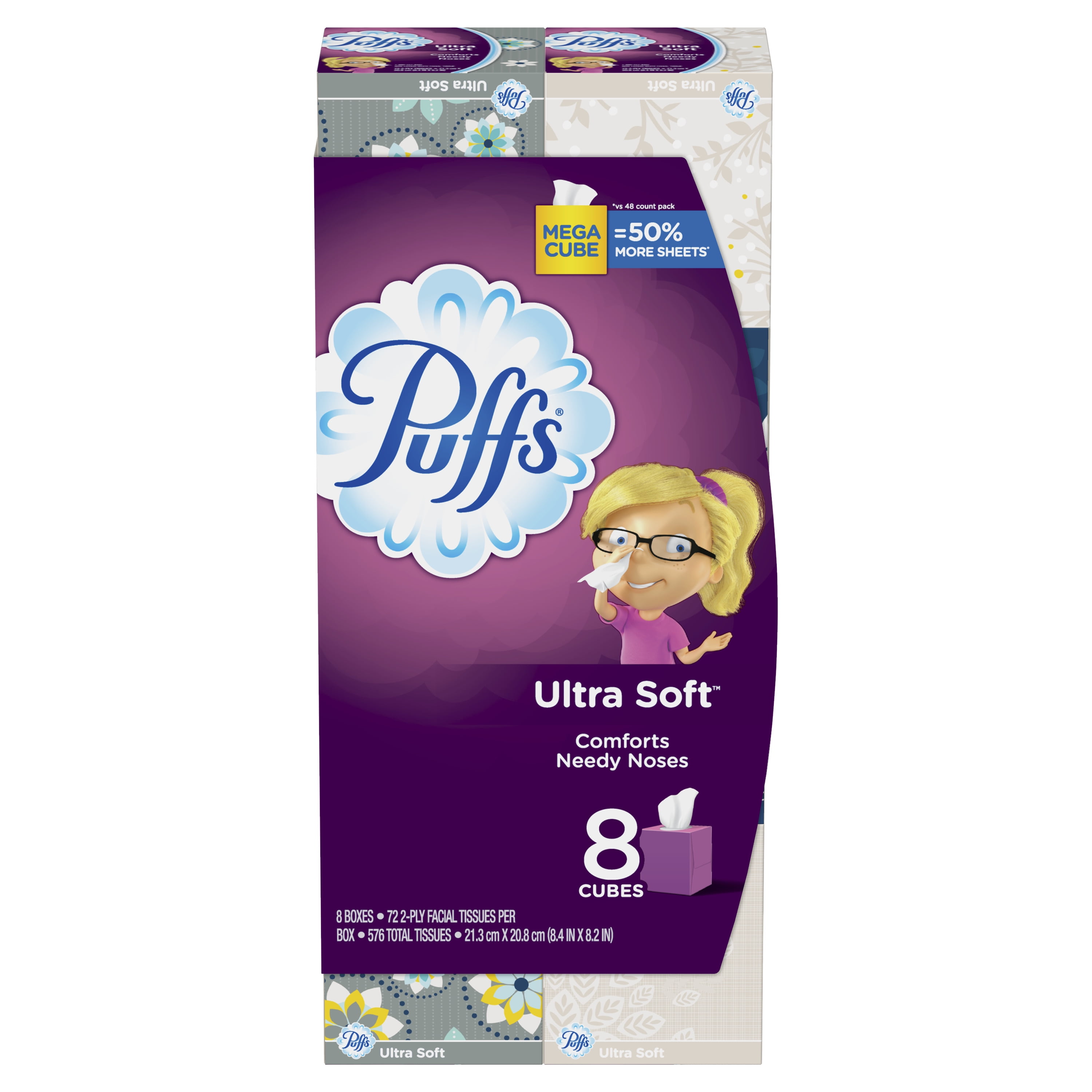 Puffs Ultra Soft is our most comforting lotion-less facial tissue in a mega cube box. Puffs Ultra Soft is the perfect tissue for when sore or runny noses need some extra non-lotion softness. Puffs Ultra Soft non-lotion facial tissues are gentle, up to 2x stronger when wet (vs. the leading national regular brand), and have maximum absorbency. These tissues offer the softness and strength your delicate nose needs, especially during allergy season. A nose in need deserves Puffs indeed!Puffs Ultra Soft Non-Lotion Facial Tissues, 8 Mega Cubes, 72 Facial Tissues per cube