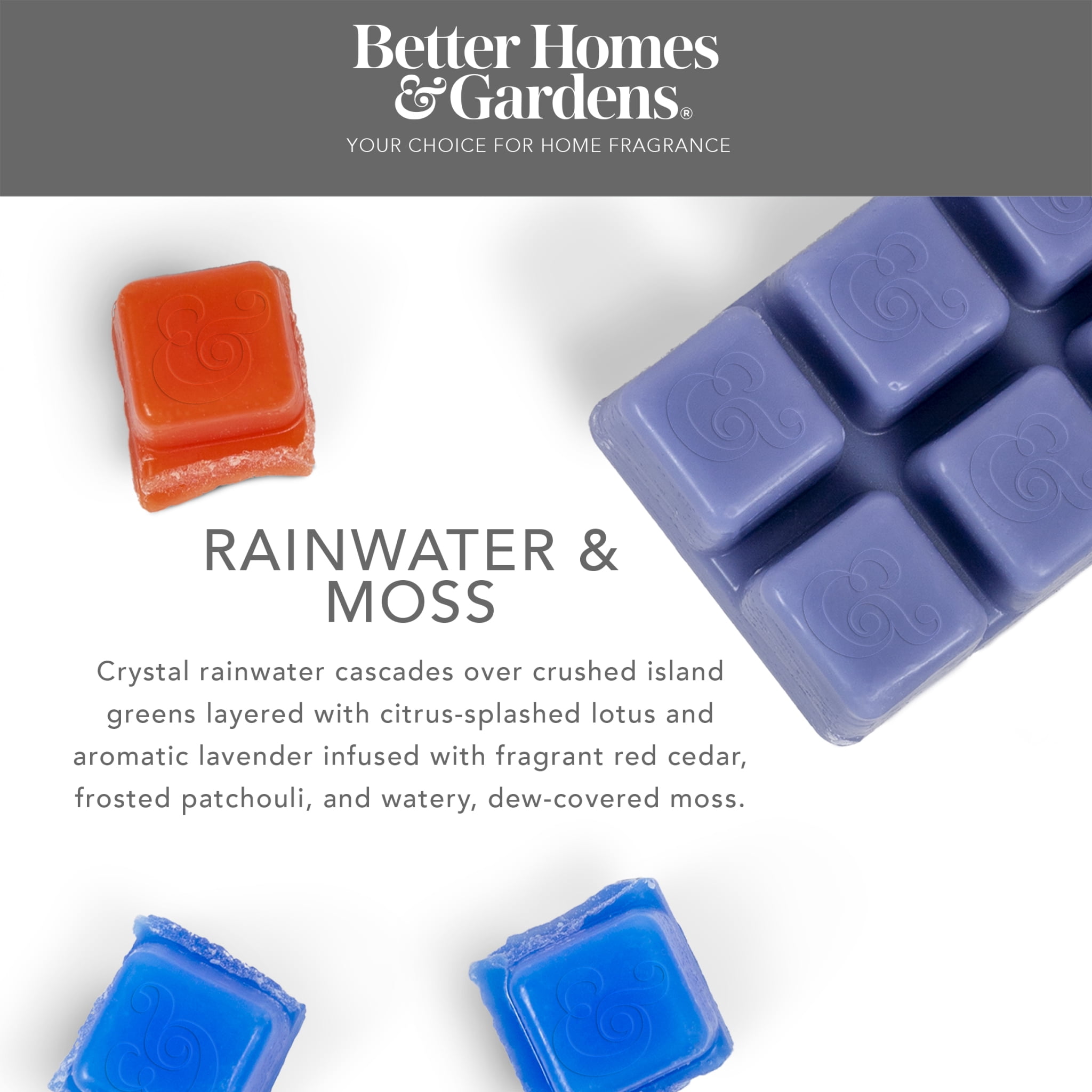 Better Homes & Gardens 3.5 oz Rainwater & Moss Premium Scented Wax Melt features crystal rainwater cascades over crushed island greens layered with citrus-splashed lotus and aromatic lavender infused with fragrant red cedar, frosted patchouli, and watery, dew-covered moss. Better Homes & Gardens 3.5 oz Rainwater & Moss Scented Wax Melts are for use in an fragrance warmer and release a soothing highly fragrant scent into the air immediately upon melting. These premium wax melts are ideal for spreading a relaxing scent and welcoming atmosphere throughout your home. This premium wax melt line features more fragrance per cube with elevated fragrance notes. Simply break off a piece and add it to your favorite fragrance warmer.