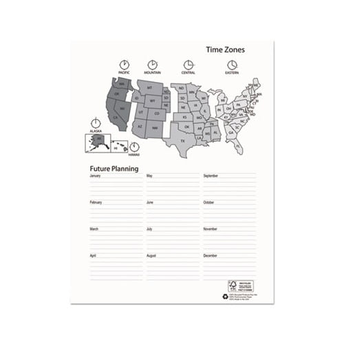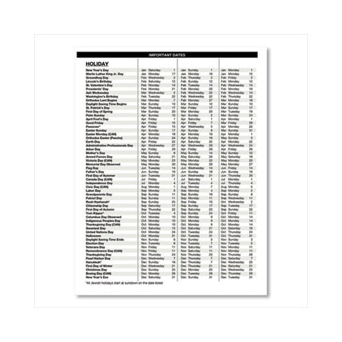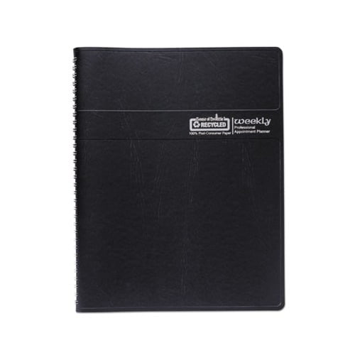 Vertical format with one weekday per column, quarter-hourly appointments and six days per week. Weeks start on Monday with a one-week per two-page layout. Three-year reference calendar page aids in long-range planning. Includes a double-sided storage pocket. Additional page lists important holiday dates over a span of three years. Features printed monthly indicators to help you quickly find the date you need. Made entirely of recycled materials. Wirebound Soft CoverBlack, embossed leatherette finished soft cover. Size: 11 x 8.5 Page Color/Theme: White/Blue Appointment Ruling: 15-min, 7 AM to 8:45 PM Mon-Fri 15-min, 7 AM to 5:30 PM Sat Open Scheduling Sun Edition Year: 2021. Green : Printed on 100% recycled paper containing 100% post-consumer recycled content, using soy inks, 50% recycled cover material, and 90% recycled wire.