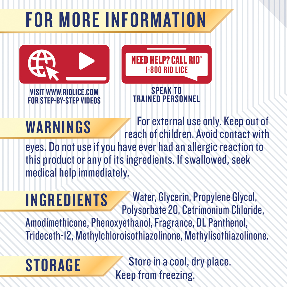 - KIT CONTAINS: One (1) 4-ounce bottle RID Lice Killing Shampoo, one (1) 2-ounce bottle RID Lice & Egg Comb-Out Spray, and one (1) patented RID Lice Comb for removing lice eggs and nits.