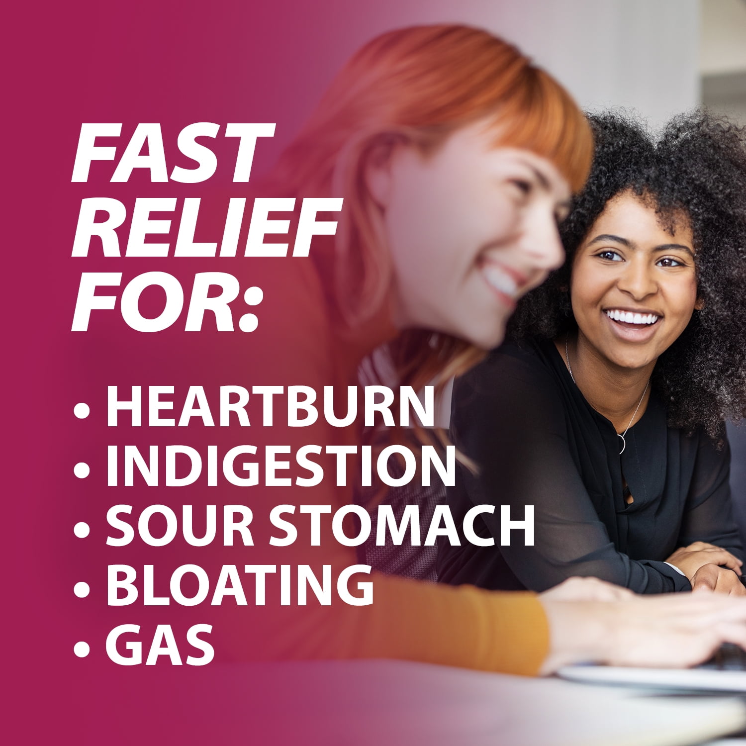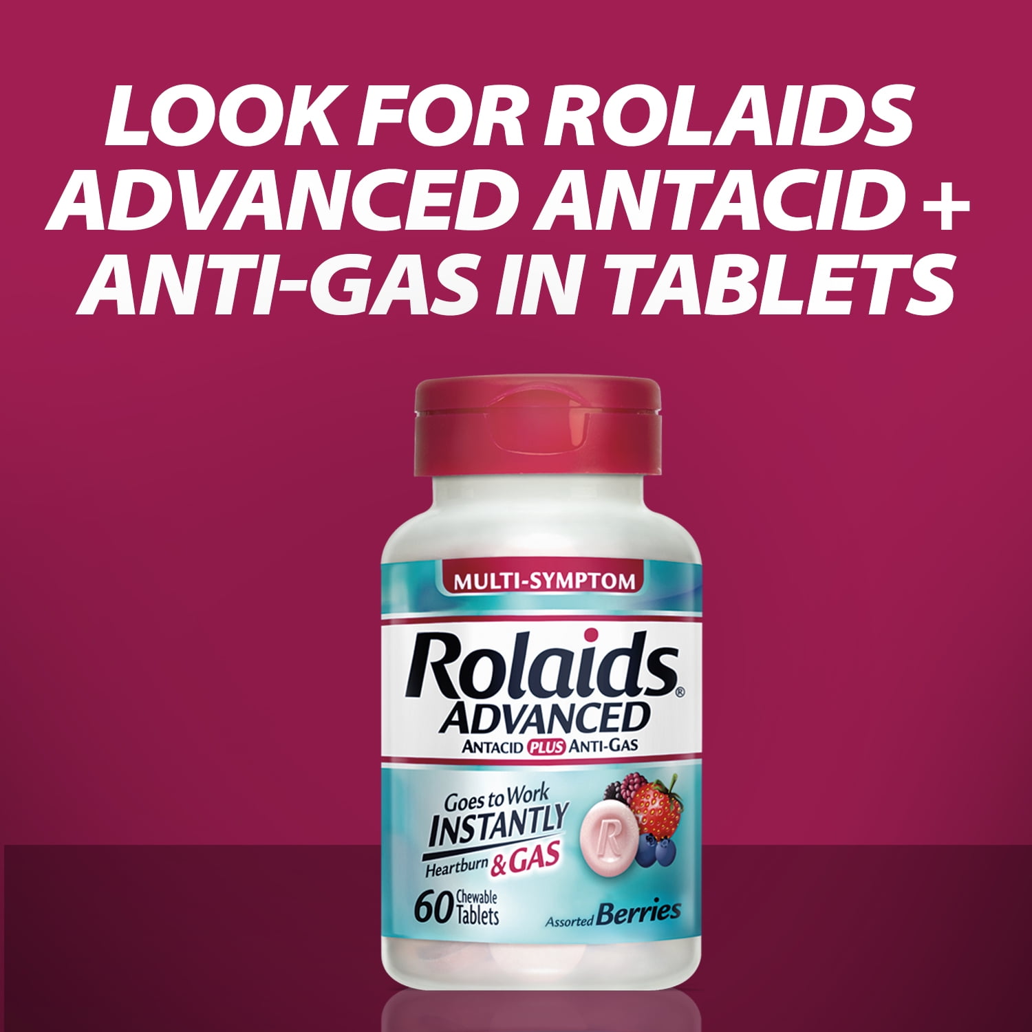 When your heartburn symptoms come with bloating and gas, look to Rolaids Advanced Antacid Plus Anti-Gas Softchews for relief. This antacid soft chew delivers multi-symptom relief including heartburn relief, plus bloating and gas relief so you can get back to being you quicker. Also available in tablet form, new Rolaids Advanced Softchews make heartburn relief great-tasting with a mixed berry flavor and chewy texture. Best of all, Rolaids Advanced Antacid Plus Anti-Gas Softchews neutralize 60% more acid than Tums Ultra 1000.* This 28-count pack of antacid relief comes in a resealable pouch so you can have a few on hand anytime, anywhere you need them. *Acid neutralization does not correlate with symptom relief.