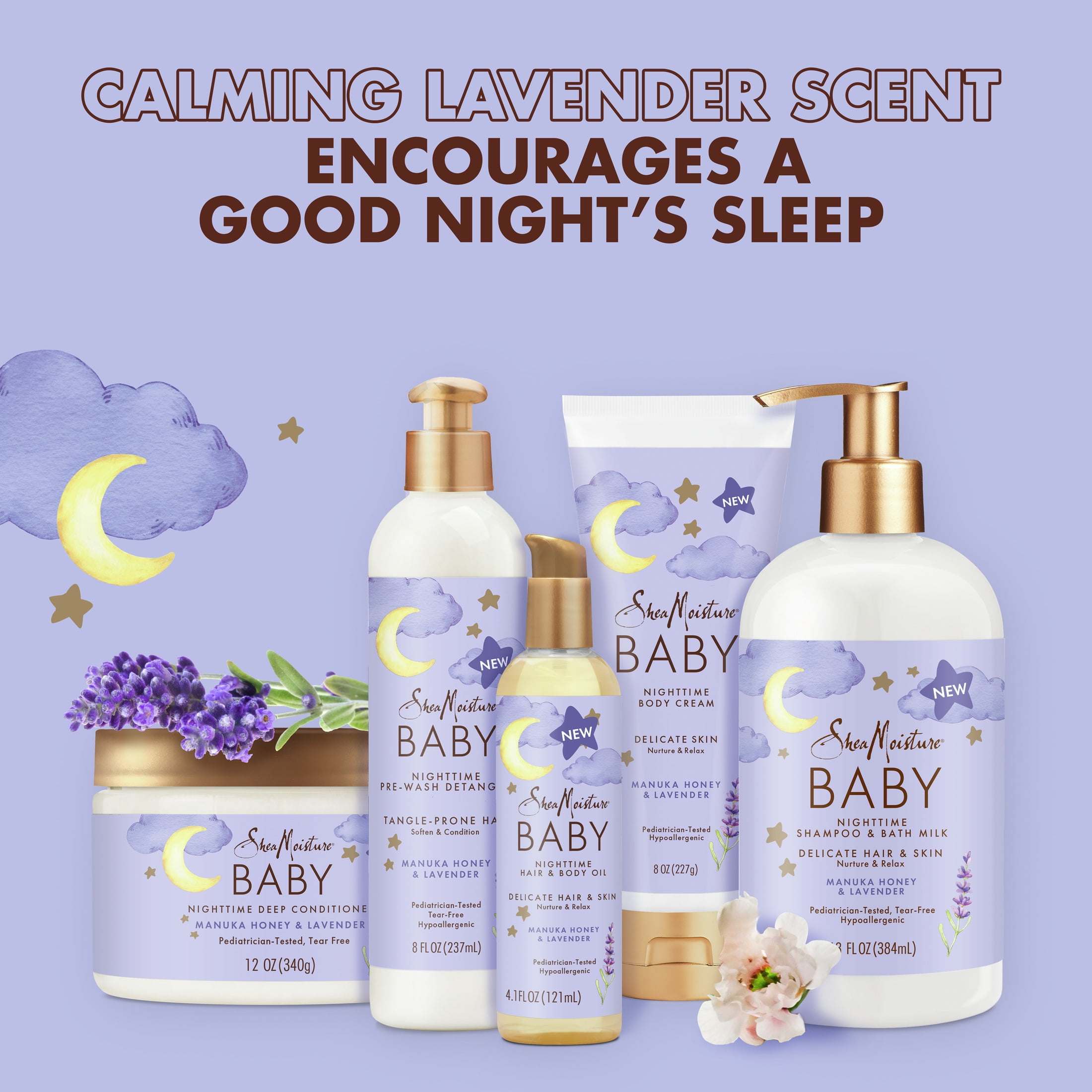 SheaMoisture Baby Nighttime Body Cream Manuka Honey & Lavender, 8 oz creates a relaxing nighttime skin care regimen. Nurture and protect your baby’s delicate skin with this moisturizing Body Cream. Blended with plant-based oils, Manuka Honey and a soothing lavender scent, this body cream formula nourishes your baby’s skin, making it even softer to the touch. It’s the perfect addition to your relaxing nighttime routine. Apply SheaMoisture Baby Manuka Honey & Lavender Body Cream on your newborn’s skin after bath. Excellent for a calming and relaxing massage. No parabens, no phthalates, no mineral oil, no petrolatum and no animal testing. Sustainably produced and Cruelty-Free.