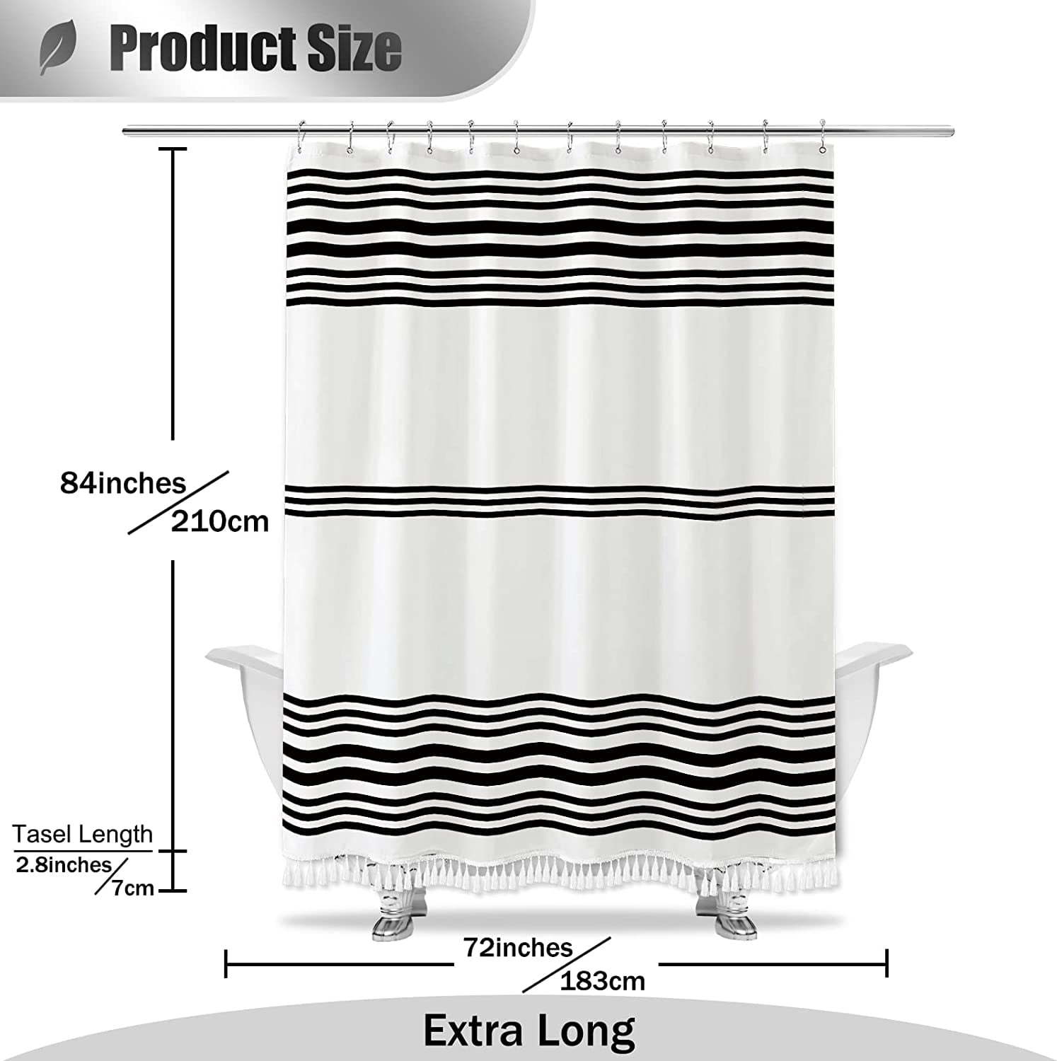 This 72×84 inch Black and white shower curtain features a timeless black stripe design that drapes beautifully for a fresh. The bottom tassels give it a modern boho twist for an fun, updated look.This is perfect for anyone wanting to add some fun and whimsy to their shower – use at home, apartment, condo, hotel, RV, dorm room, school shower, athletic club, gym, bathroom,bathroom window curtain, party backdrop.
