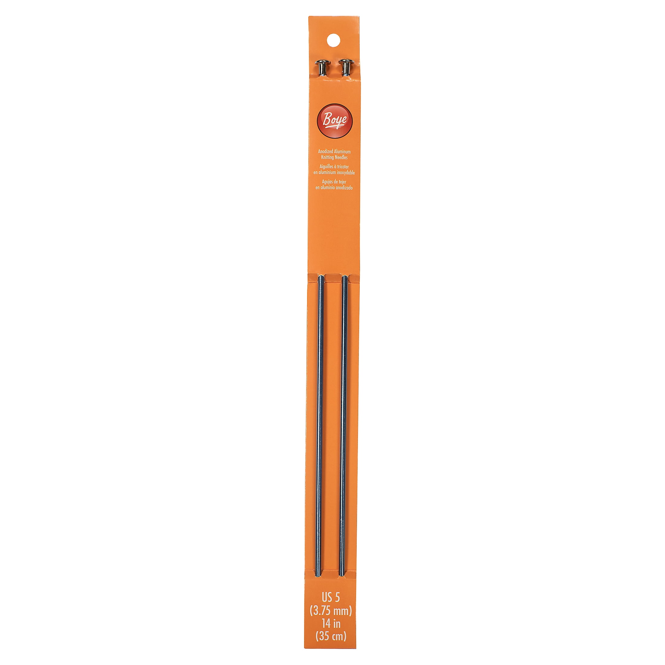 Boye has been a trusted brand since 1906 and is now recognized as a premier supplier of crochet hooks, knitting needles, looms and other accessories for those who love to work with yarn. These 14 inch, US size 5 (3.75mm) single-point knitting needles are precisely sized and accurately balanced. The unique perfection points help prevent splitting of yarn for easy knitting. 100% aluminum construction makes these needles lightweight and durable.Boye Anodized Aluminum Knitting Needles, 14 inch, US Size 5:• Set of two single-point knitting needles• Precisely sized and accurately balanced• Perfection points help to prevent splitting of yarn• Ideal for making sweaters, scarves, and more• Aluminum construction makes them lightweight and durable