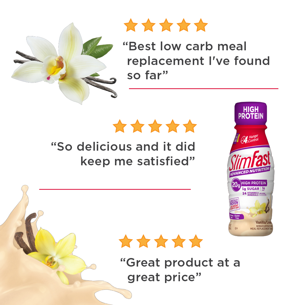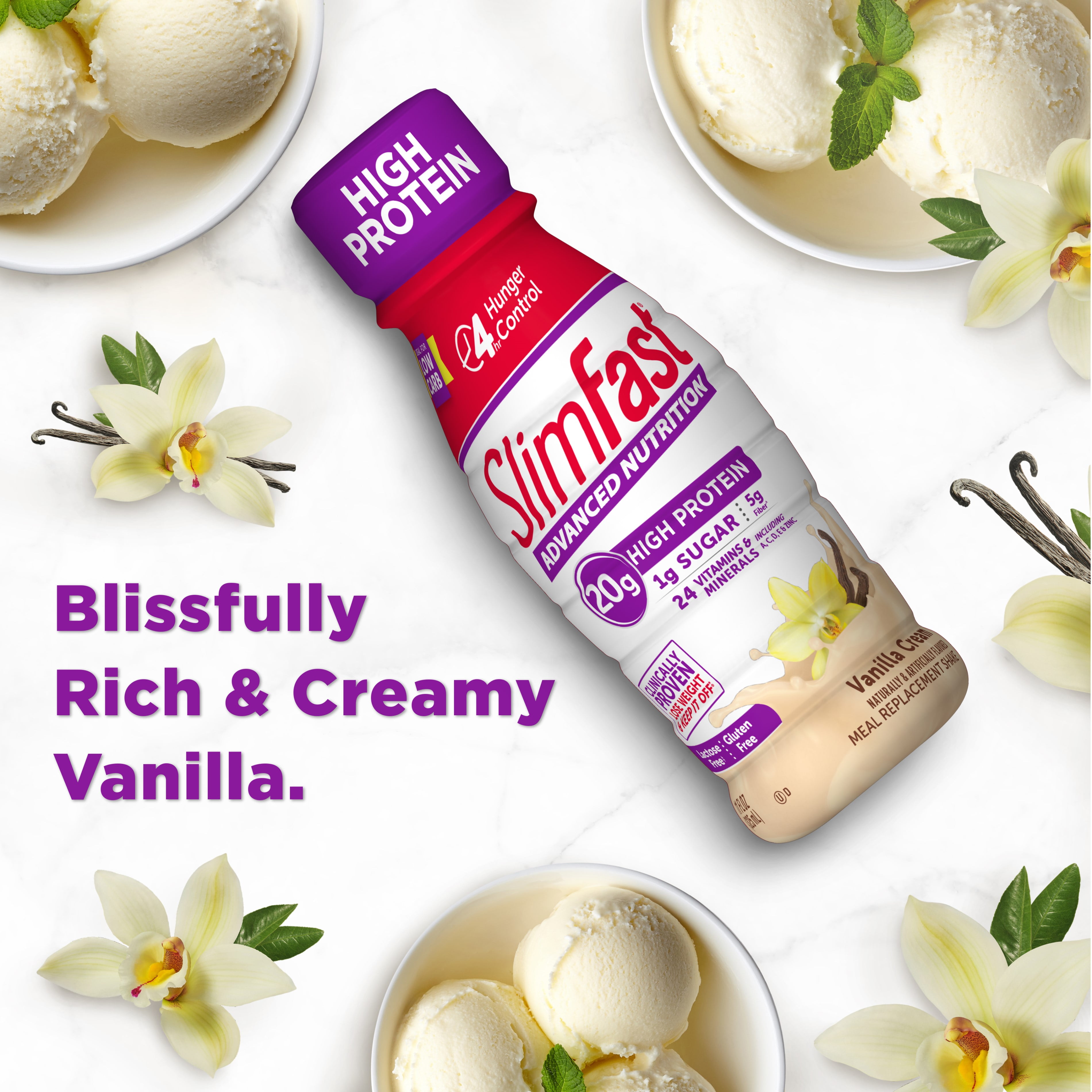 SlimFast Advanced Nutrition is a specially formulated high protein meal replacement shake with 20g of protein, 1g sugar, and 5g of fiber^ to help control hunger for up to 4 hours. Satiety was measured in a laboratory setting.