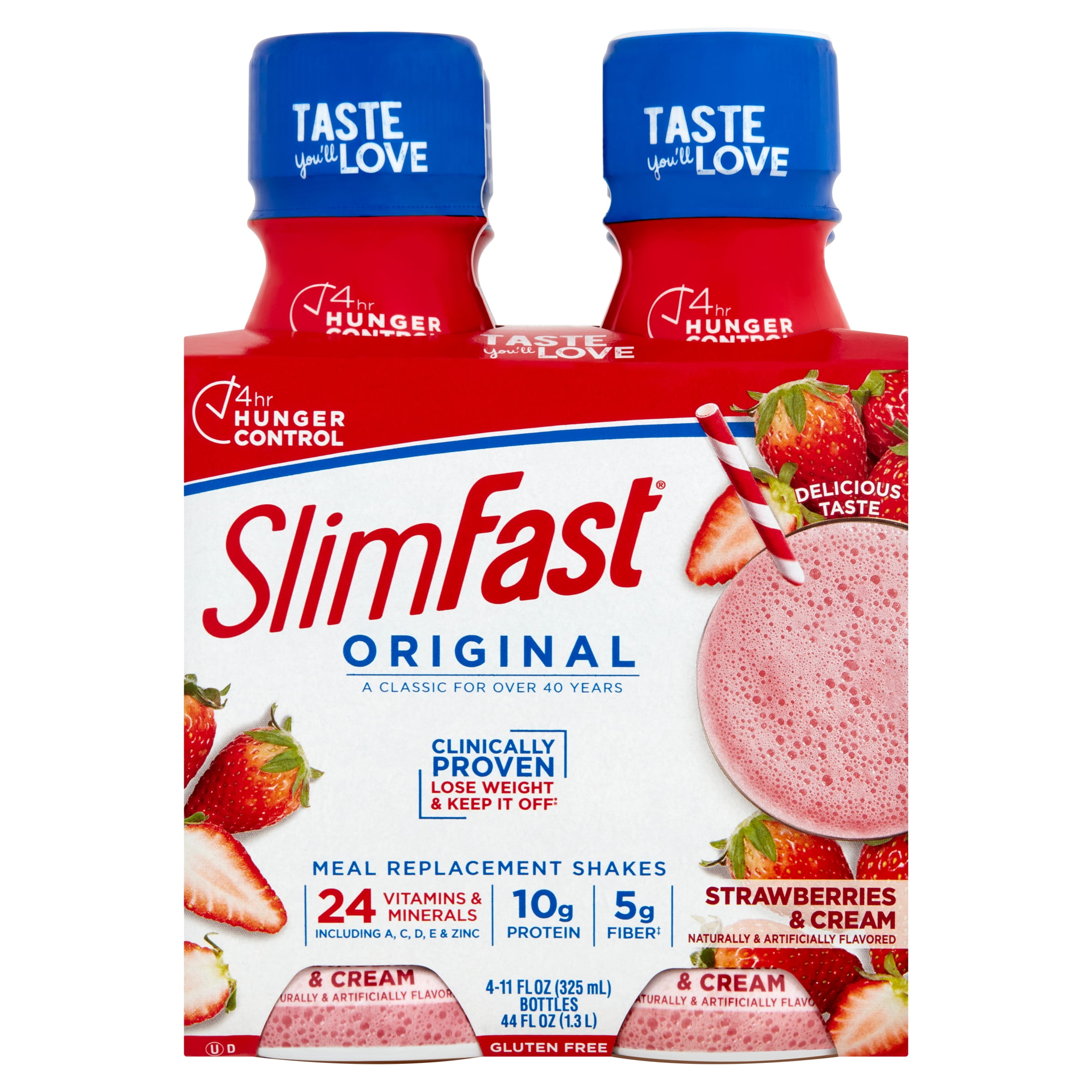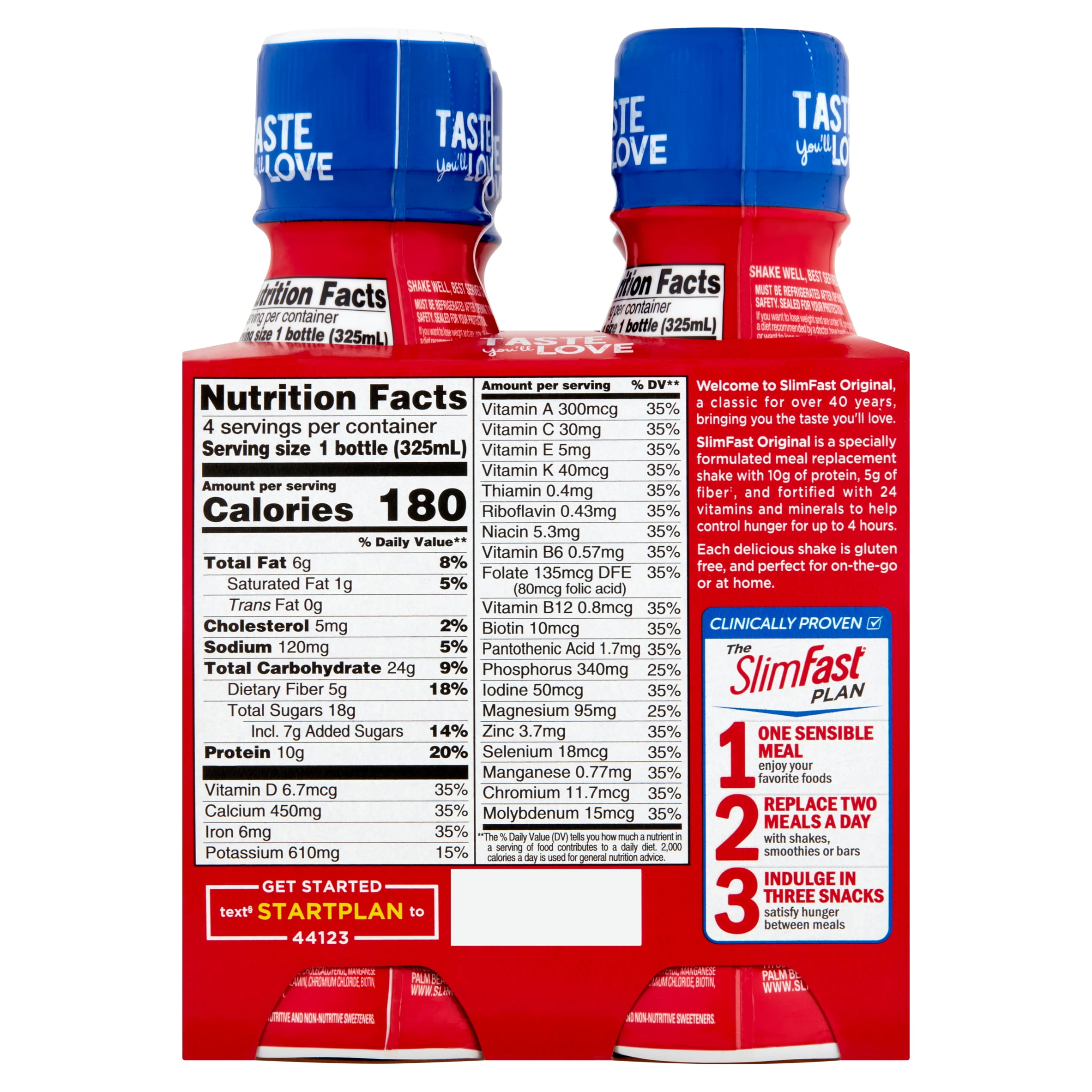 SlimFast Original is a specially formulated meal replacement shake with 10g of protein, 5g of fiber, and fortified with 24 vitamins and minerals to help control hunger for up to 4 hours. Satiety was measured in a laboratory controlled setting. Each delicious shake is gluten free, and perfect for on-the-go or at home.