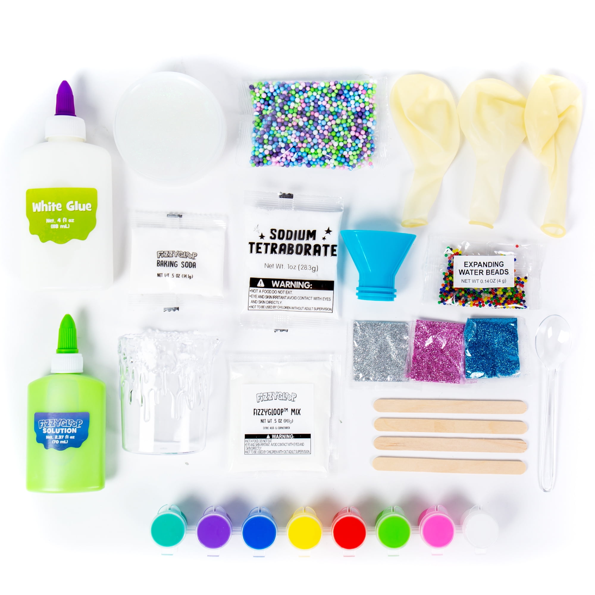 - Kit Includes: 1 Storage Case with Workstation Lid, 1 Acrylic Paint Strip (White, Pink, Lime Green, Red, Yellow, Blue, Purple, Turquoise) 5 mL Each, 1 Plastic Spoon, 3 Latex Balloons, 1 Bag of Sodium Tetraborate (1 oz), 4 Wooden Craft Sticks, 3 Glitter Packets (Silver, Light Blue, Pink) 2g Total, 1 Bag of Baking Soda (0.5 oz), 1 White Glue Tube (4 oz), Pre-Made Glitter SLIMYGLOOP® (2.5 oz) in Resealable Container, 1 Blue Funnel, Expanding Rainbow Water Beads (4g), 1 Plastic Beaker, 1 FizzyGloop® Mixture (0.5 oz), Tube of Paint (Neon Green) 70 mL, Easy-to-Follow Instructions