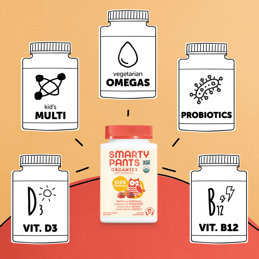 SmartyPants Organic Kids Formula gummies are specifically formulated with 13 premium nutrients including vegetarian omega-3 ALA from organic flaxseed oil, vitamin D2 for bones, vitamin D3 for immunity, vitamin B12 for energy, and vitamin A for eyesight. It’s your little one’s delicious (and nutritious) gummy that you can trust.*SmartyPants Organic Kids Formula is USDA Certified Organic, AVA Certified Vegetarian, non-GMO, gluten-free and free of synthetic colors, artificial flavors or sweeteners. Organic Kids Formula features thoughtfully-selected nutrients tested for purity and potency, and based on the latest scientific research to fill average nutrition gaps in an average diet, and includes the premium forms of nutrients their body prefers, whenever possible.