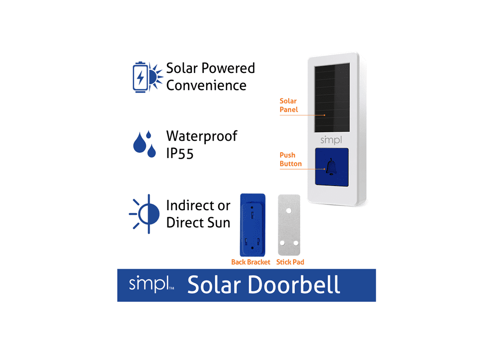 The smpl Doorbell Add-On is simple to install and use. Quickly & easily mount the self-charging Solar Doorbell anywhere outside. Charges in direct & indirect sunlight. Weather resistant. Pairs will all other SMPL Alert products.