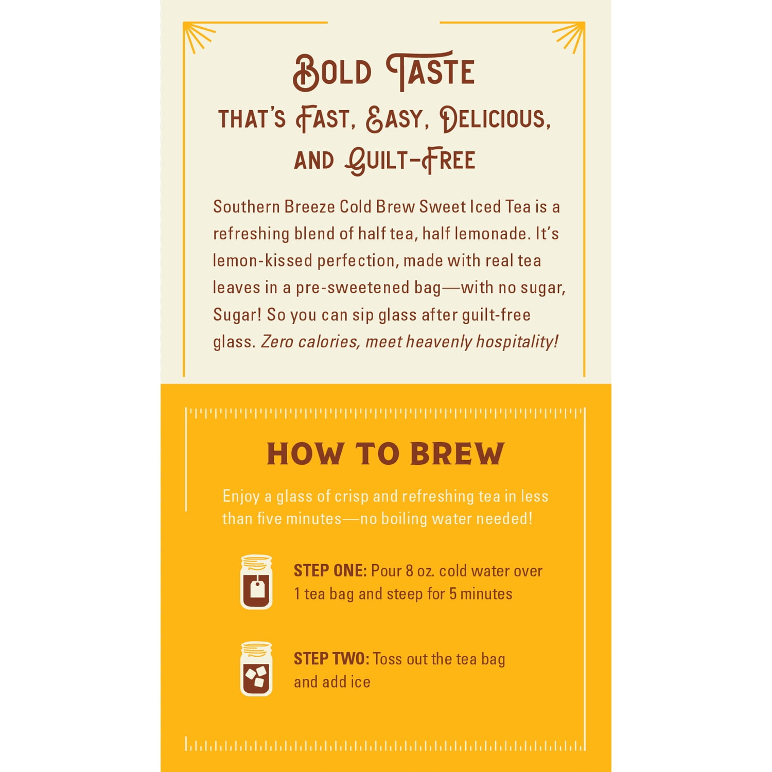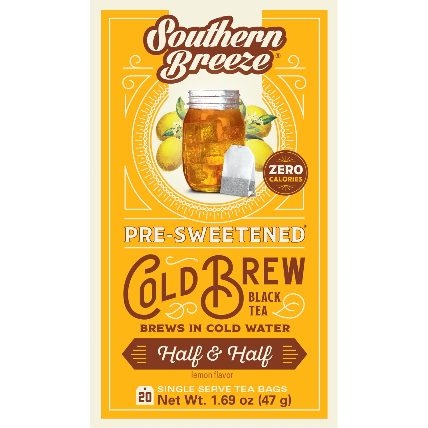 Southern Breeze Cold Brew Half and Half Sweet Iced Tea is a refreshing blend of half tea, half lemonade. It’s lemon-kissed perfection, made with real tea leaves in a pre-sweetened bag that you cold-water brew, steep, chill and enjoy—and with no sugar, Sugar! So you can sip and share glass after guilt-free glass. Zero calories, meet heavenly hospitality.