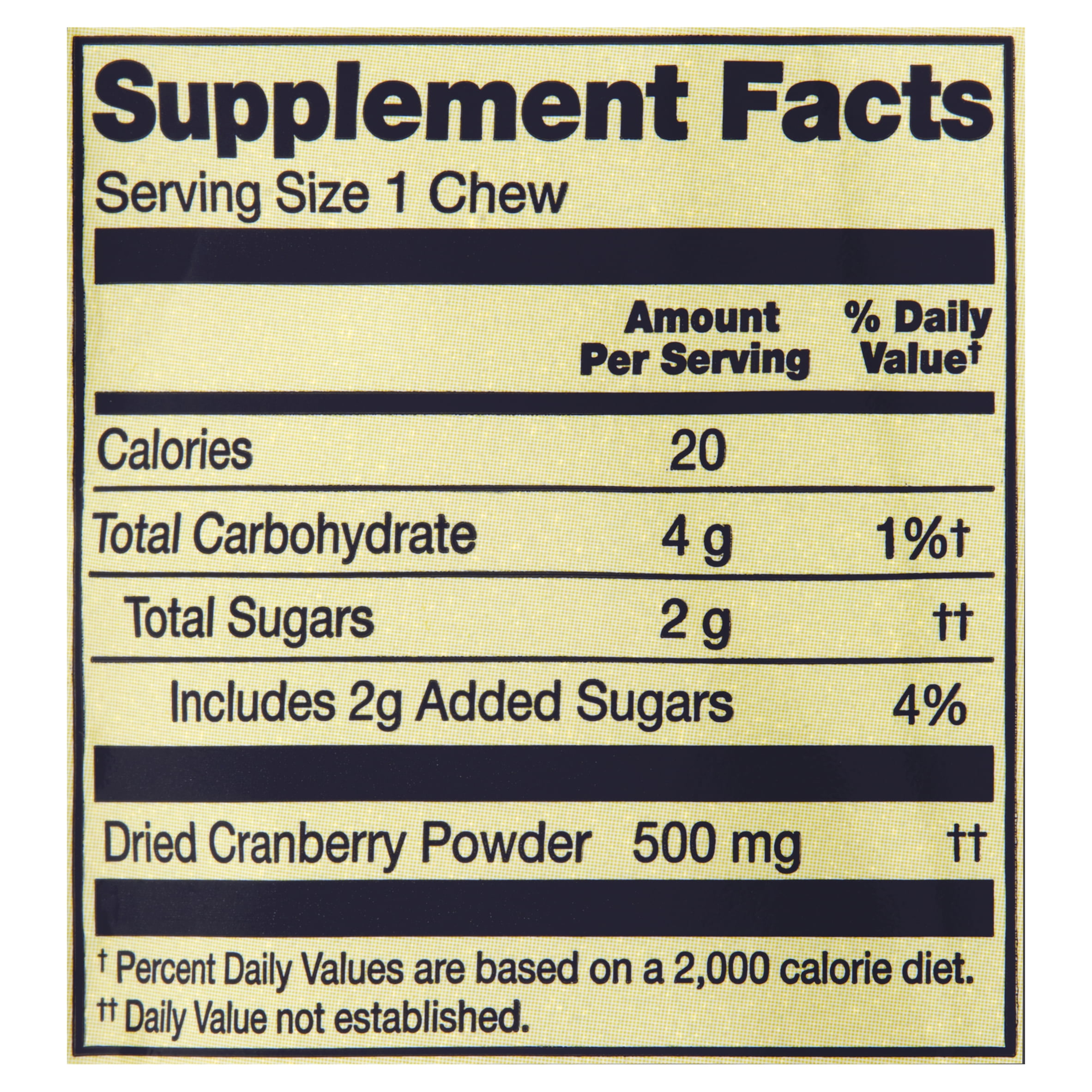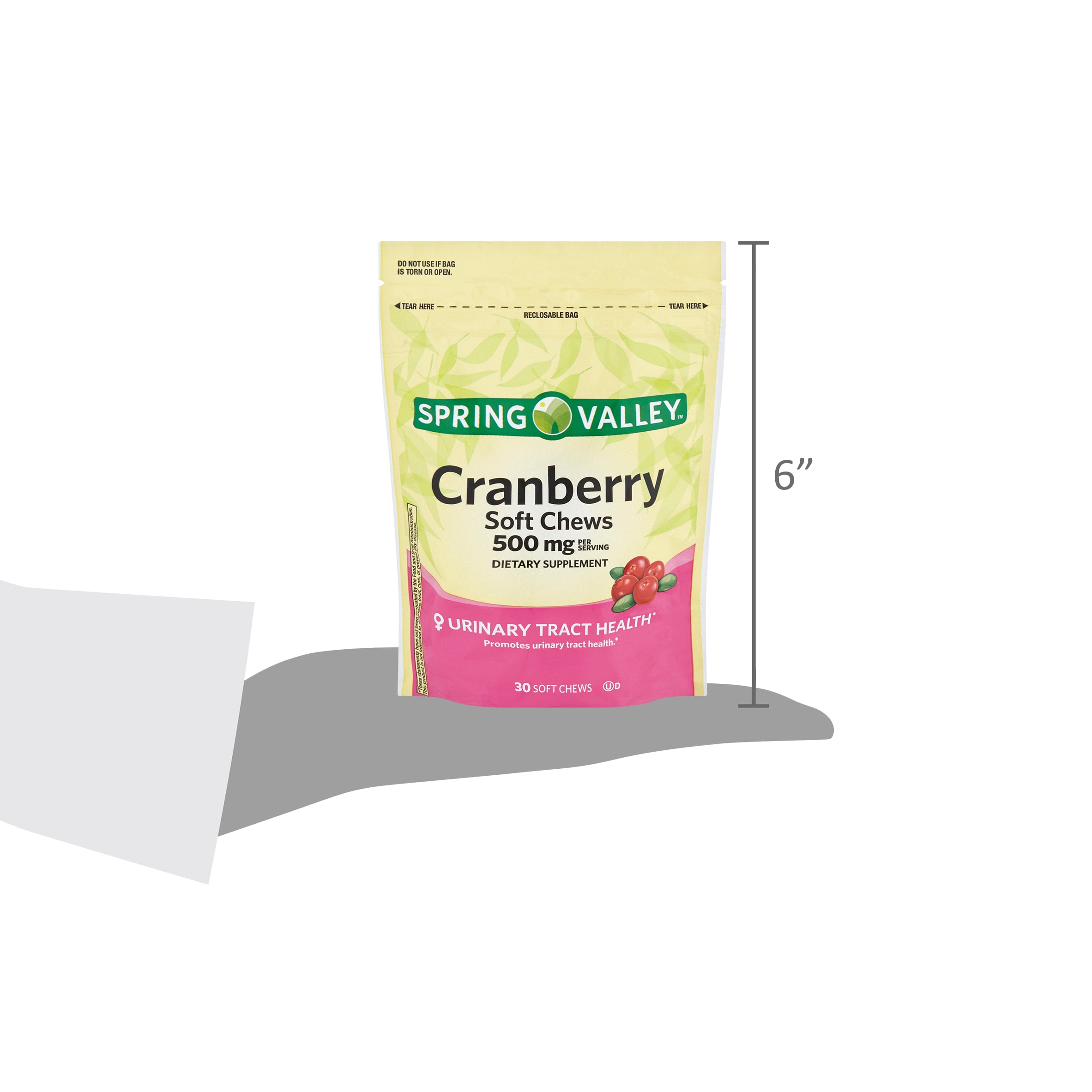 Spring Valley Cranberry Soft Chews Dietary Supplement, 500 mg are dietary supplements that promote urinary tract health. Each convenient, resealable bag contains 30 soft chews, each packed with 500 milligrams of dried cranberry powder and only two grams of sugar. The suggested dose is one chew per day with a meal. These chews contain soy, but are free from gluten and added preservatives. You can rest assured that Spring Valley Cranberry Soft Chews Dietary Supplement, 500 mg are produced with strict quality guidelines and backed by our quality guarantee.