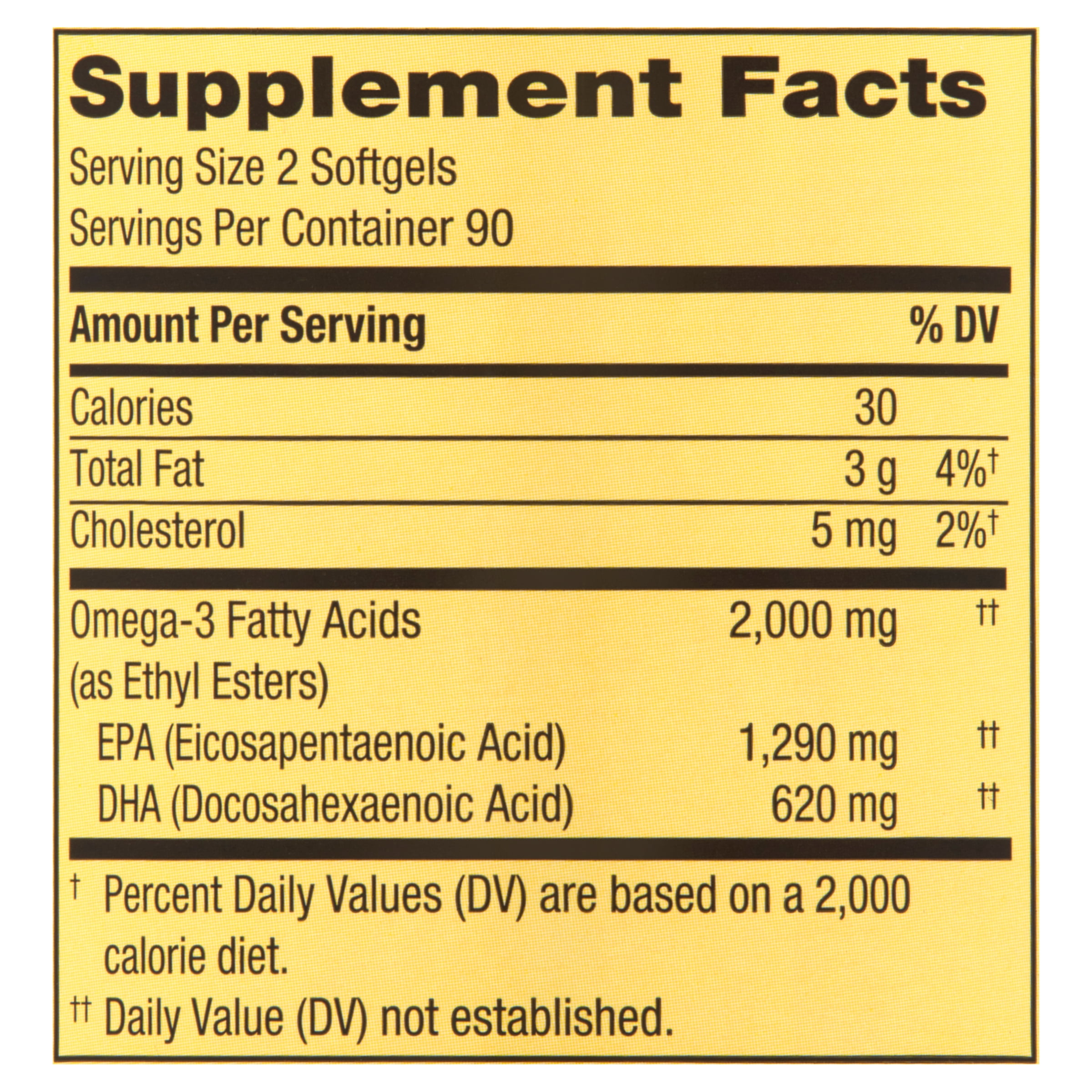 Our Spring Valley Omega-3 from Fish Oil Maximum Care are a daily supplement with natural lemon flavor that provide a range of benefits for your health. Depending on your needs, just one softgel per day can help to support heart, brain and general health. The active ingredients are long-chain fatty acids EPA (eicosapentaenoic acid) and DHA (docosahexaenoic acid). These fatty acids are important nutrients that your body cannot naturally make on its own. In addition, numerous studies have found that about 95% of Americans do not consume enough Omega-3 fatty acids in their diet, which is why our Spring Valley 2000mg Omega-3 Softgels include a combination of 1290 mg of EPA and 620 mg of DHA. A quality supplement starts with high quality ingredients, so be sure to turn our Spring Valley Omega-3 from Fish Oil Maximum Care— a supplement whose quality is certified by leading industry groups.