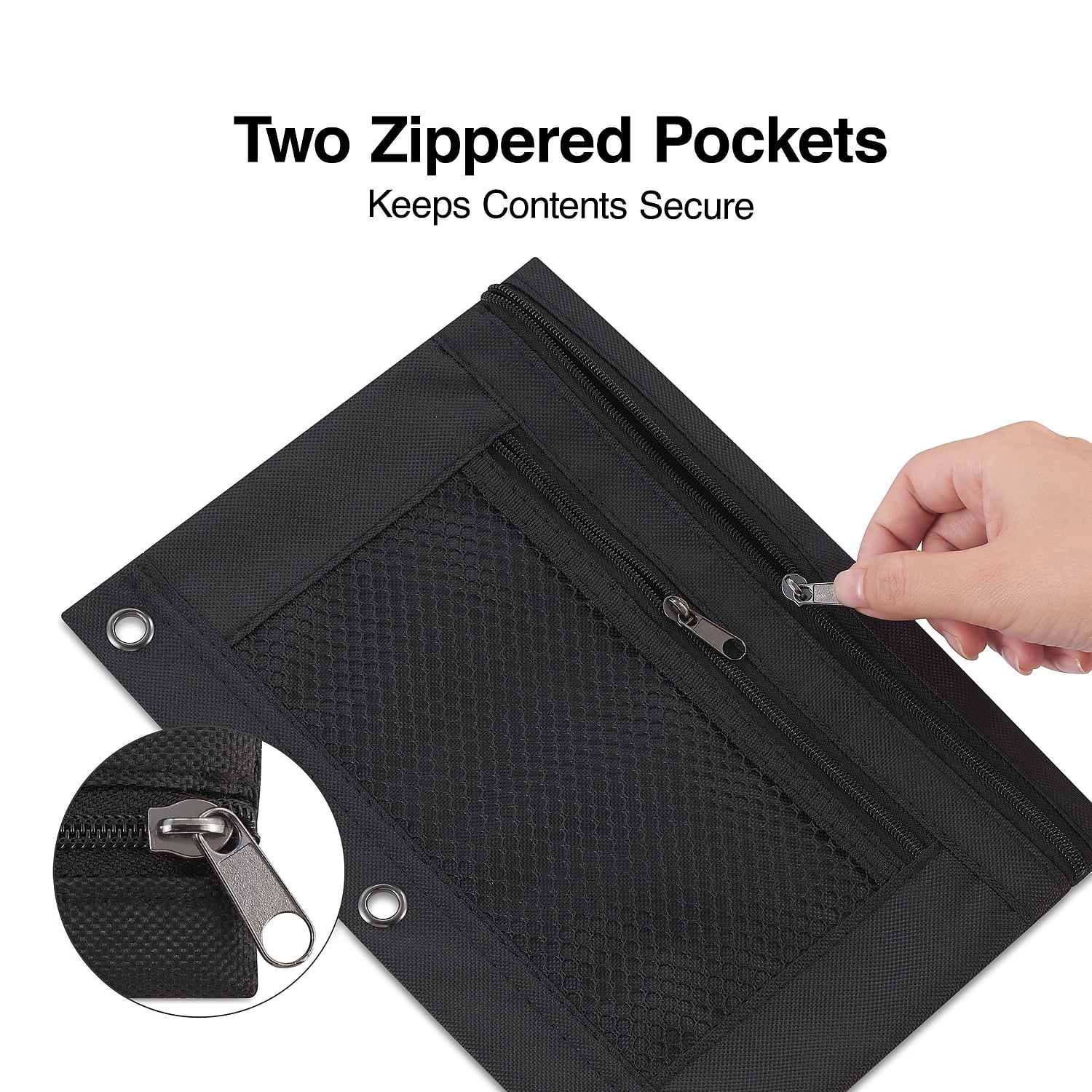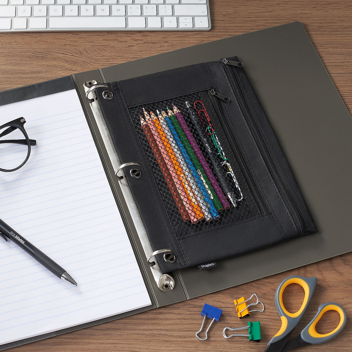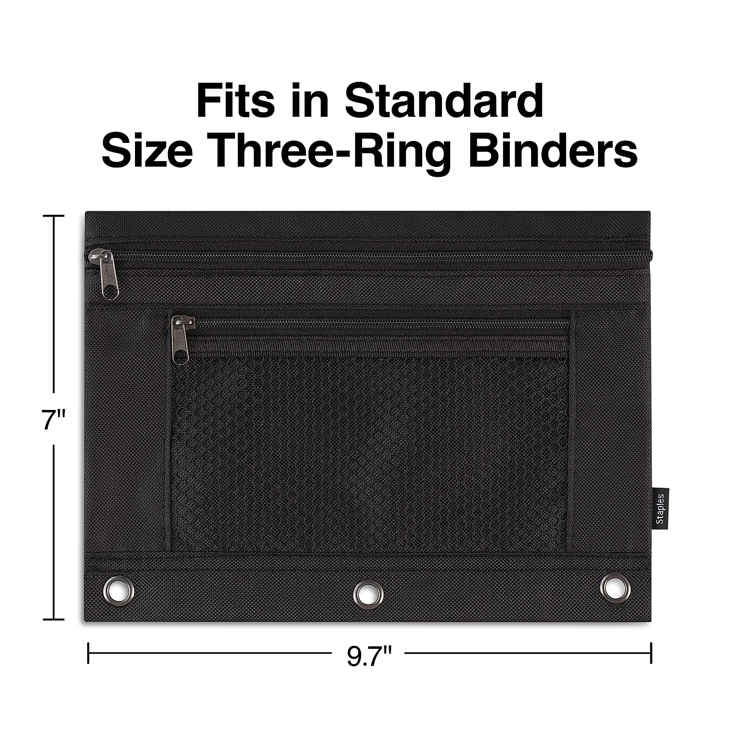Keep small office supplies stored inside a binder with this Staples black three-ring pencil pouch.Stash pens, pencils and other small items inside this three-ring pencil pouch. Two zippered compartments make it easy to organize your supplies, while the durable construction stands up to frequent use. The reinforced holes work with standard three-ring binders for easy access during classes or business meetings. With a neutral black color, this Staples three-ring pencil pouch offers a professional appearance. Staples 3-ring pencil pouch has three reinforced holes for easily snapping into your binder. The pouch comes in black color and is made of polyester material for durability. 0.43"H x 6.9"W x 9.7"D. Two zippered pockets for organization and storage. Large pocket to hold pens, pencils and other accessories. Smaller mesh pocket provides visibility and quick access. Staples brand 100% satisfaction guarantee. Sold as 1 Each.