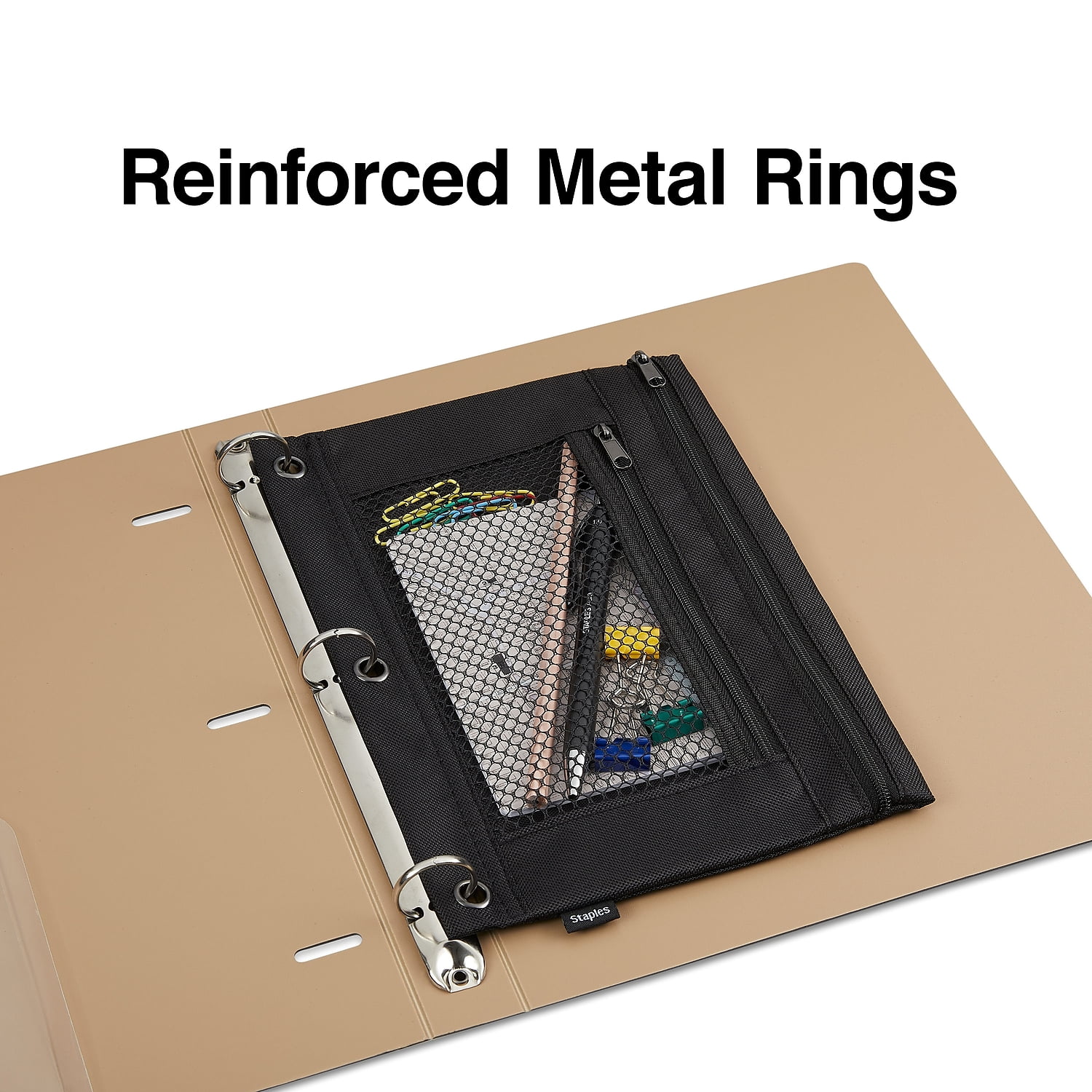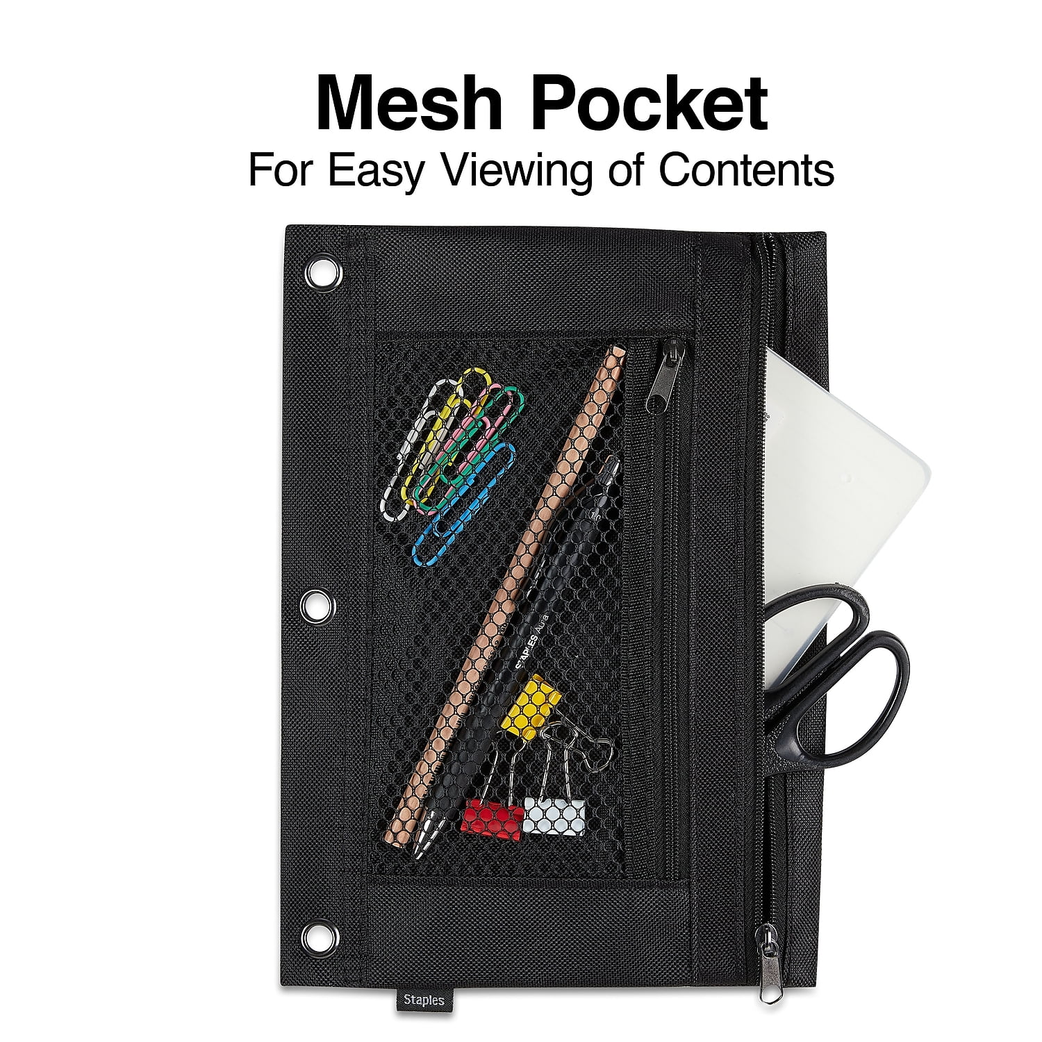 - Staples 3-ring pencil pouch has three reinforced holes for easily snapping into your binder. Large pocket to hold pens, pencils and other accessories.
