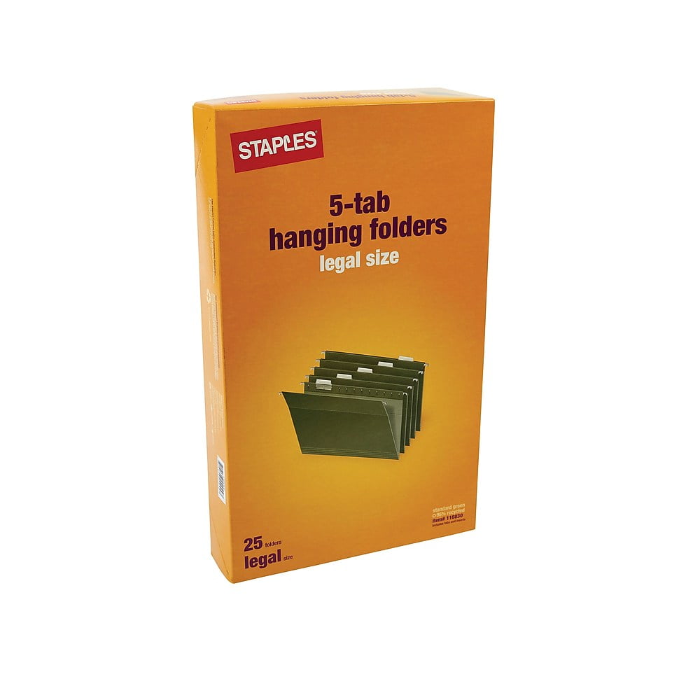Customize your filing system for quick access to documents with this Staples Eco-ID five-tab legal-size green hanging file folder.Organize big projects by color with this five-tab green hanging file folder. The five assorted tabs offer a variety of filing options, helping you find specific documents quickly for maximum efficiency, while the expandable design accommodates large documents easily. This Staples Eco-ID five-tab legal-size green hanging file folder features heavy-duty paper construction to withstand constant use and extend the lifespan of your files. Standard green hanging folder made of tea- resistant paper stock with durable coated hooks. Five top-position tabs allow you to customize your files. File folder tabs are detachable. Holds legal-size papers and files. Hanging file folder will fit in a file drawer or desktop filing system. 25 file folders per box. Made from 95% reused and recycled components. Paper point thickness: 12.5. Includes tabs and inserts. This item qualifies for an Eco-ID? mark because it’s earned one or more sustainability certifications. To learn more about how your organization can get even greener, visit our Sustainability Center https://www.staples.com/sbd/cre/marketing/sustainability-center/. Meets or exceeds SFI standard. Sold as 25/Box.