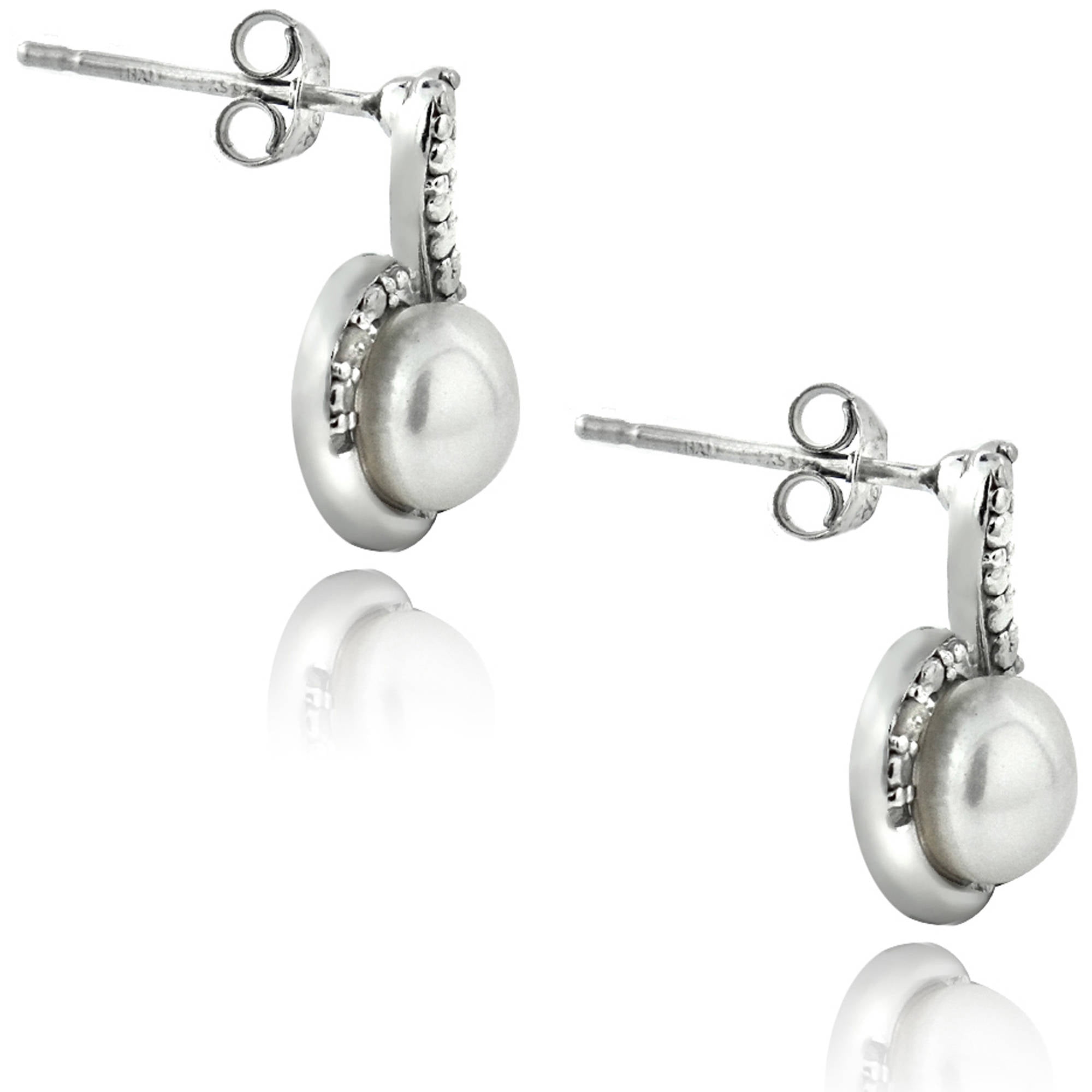 Surprise the one you love with this White Freshwater Cultured Pearl and Diamond Accent Sterling Silver Necklace and Earrings Set. All three pieces feature a lovely dotted pave swirl design. One genuine stone is set in the midst of the pattern. The swirl necklace dangles from an 18" rolo chain with a spring ring clasp. The matching earrings are secured by posts with friction backs. This sterling silver necklace has an elegant style. Pair it with a wide variety of clothing ensembles and other accessories for a completed look.Sterling Silver White Freshwater Cultured Pearl and Diamond Accent Swirl Necklace and Earrings Set:Total diamond weight: .03 ct.Swirl necklace comes with freshwater cultured pearlsMetal type: sterling silverClasp type: spring ringPearl size: 6.0mm roundDiamond setting: paveSterling silver necklace has an elegant and stylish lookHas a beautiful dotted pave swirl designComes with a single genuine diamond inside of the patternNecklace has an 18" rolo chainPairs nicely with a large variety of clothing choices