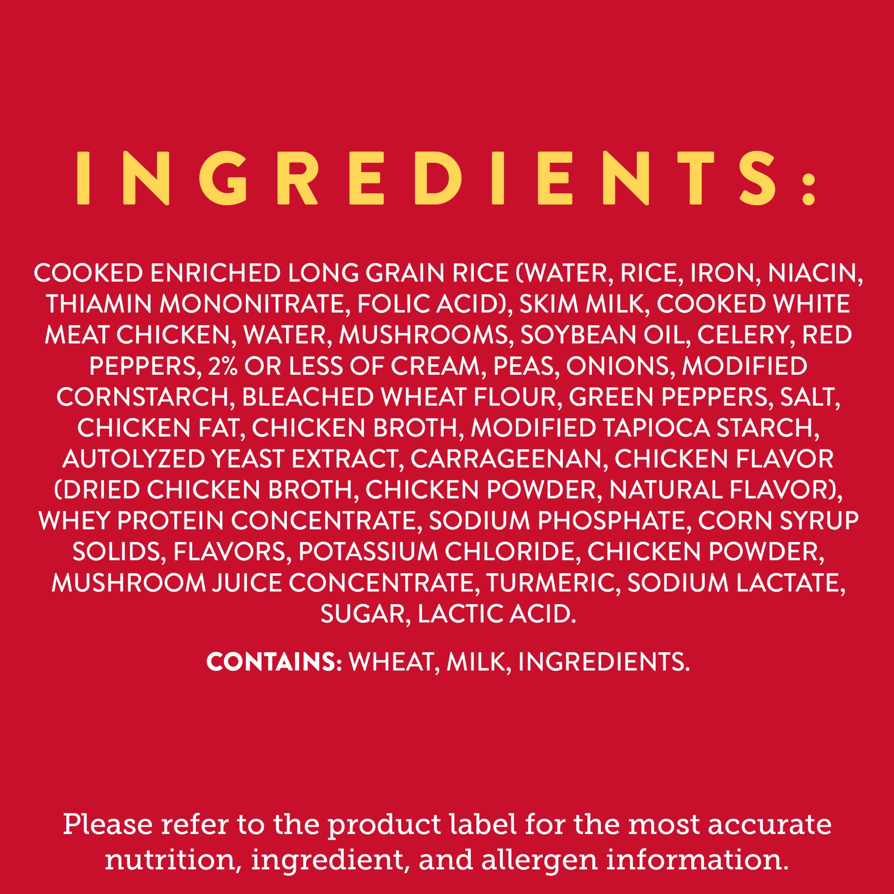 - Includes tender white meat chicken in a creamy sauce with mushrooms, red peppers, celery and peas with white rice