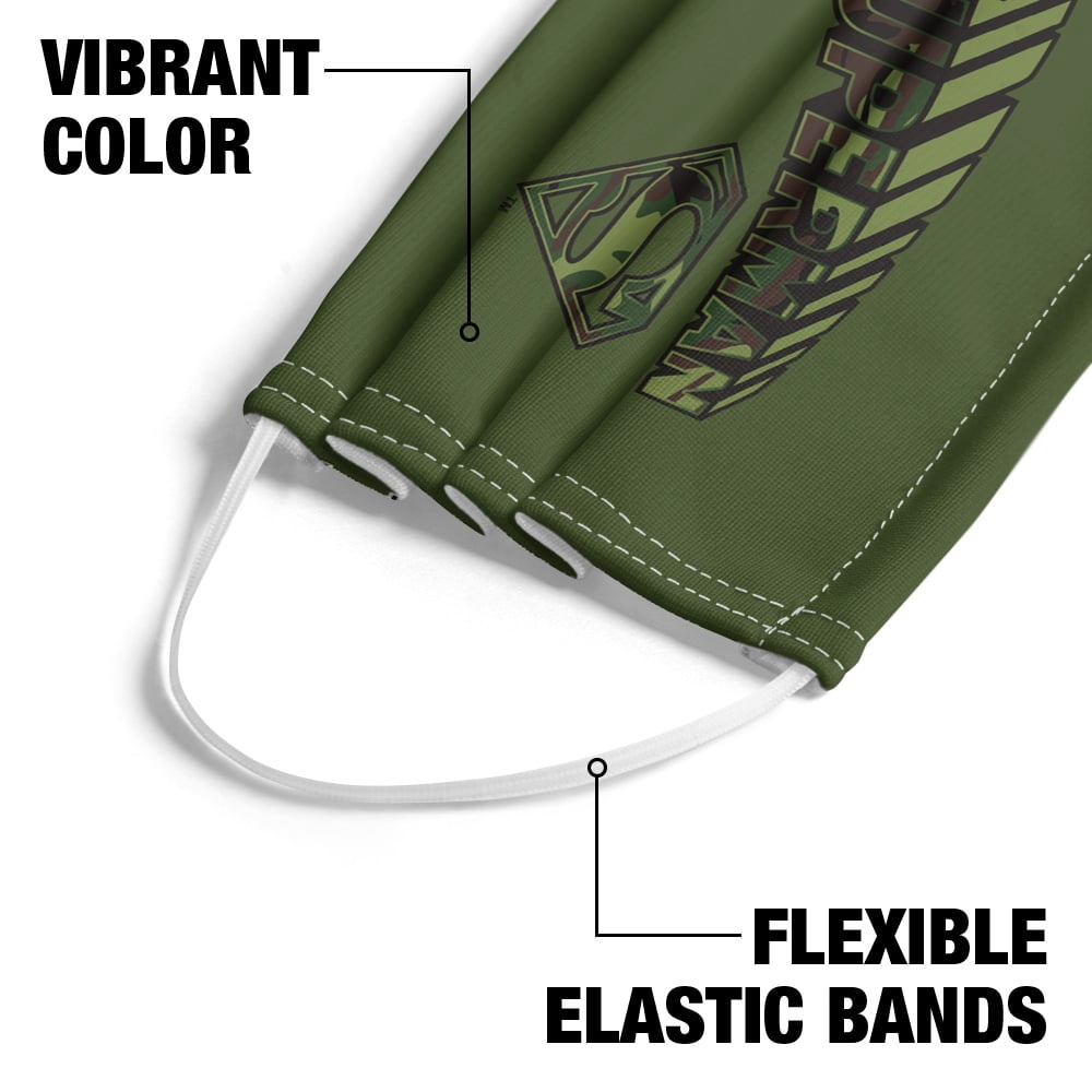 • SUPERMAN CAMO LOGO & SHIELD FACE MASK – Our 100% polyester mask is made with 1 layer that is printed with your favorite design.