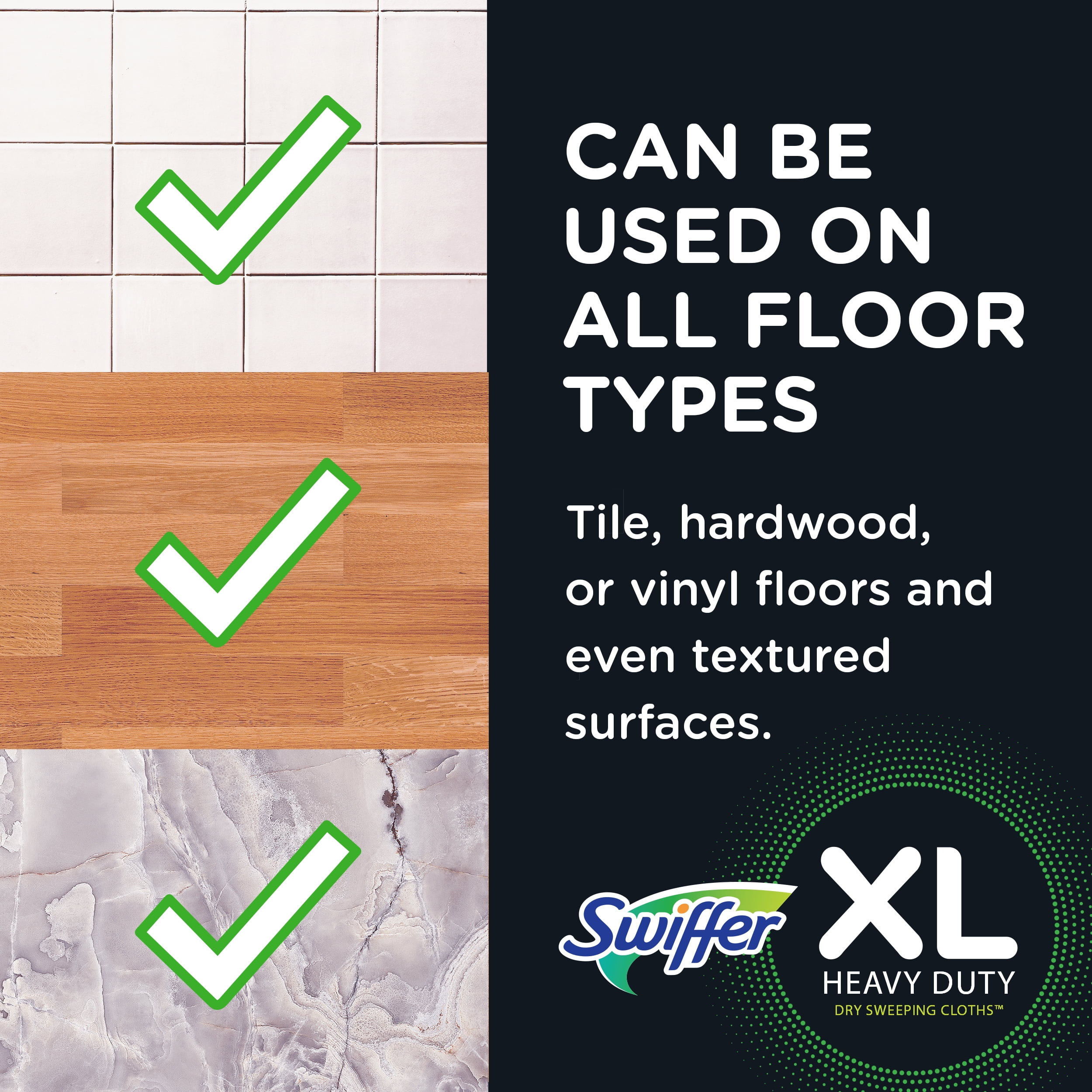 Swiffer XL Heavy Duty Dry Sweeping Cloths are 1.5X wider than regular Swiffer Sweeper cloths to pick up even more dirt, dust and hair with each swipe. Using thick dirt-grabbing ridges and grooves, our powerful dry sweeping cloths leave your floors cleaner than a broom, even on textured surfaces.