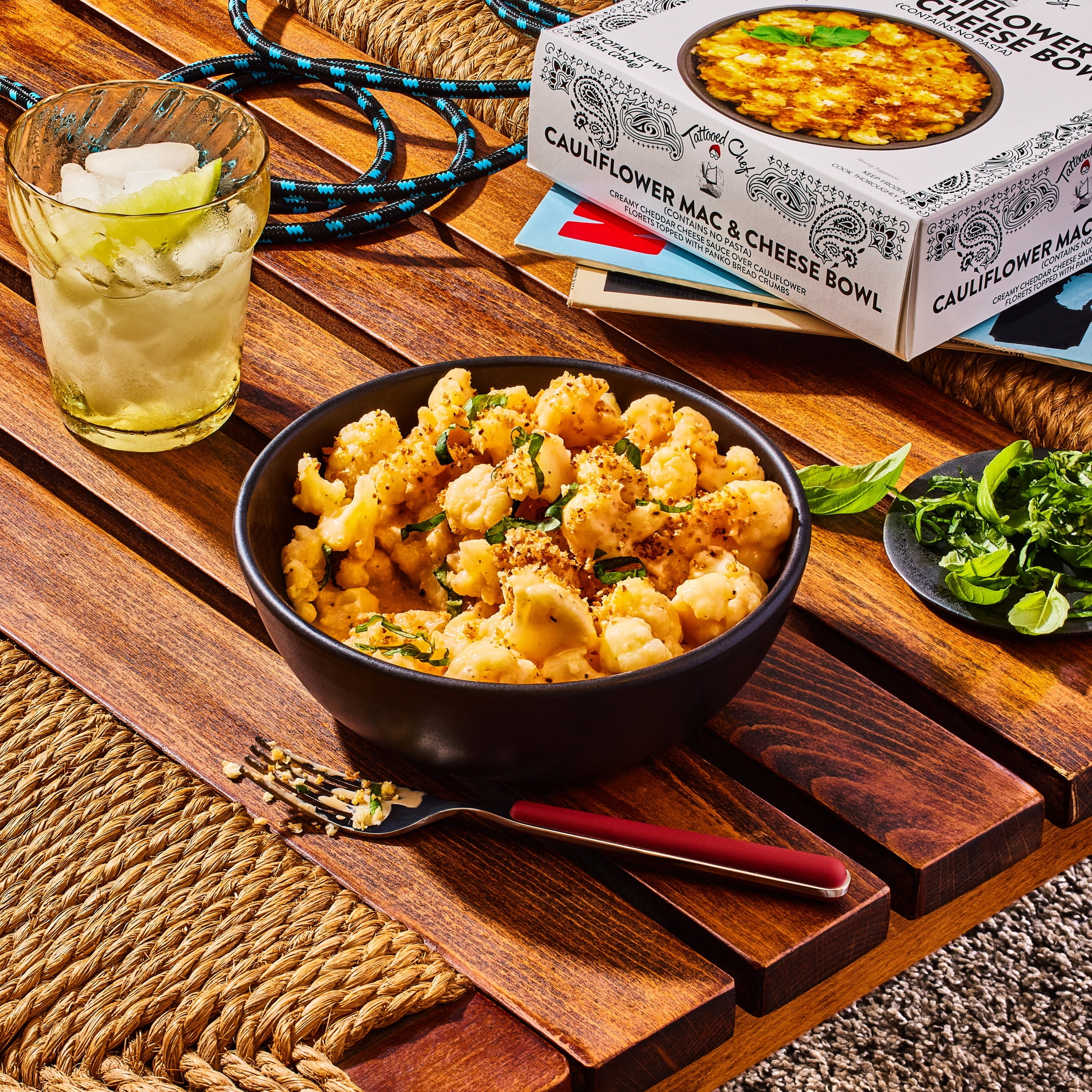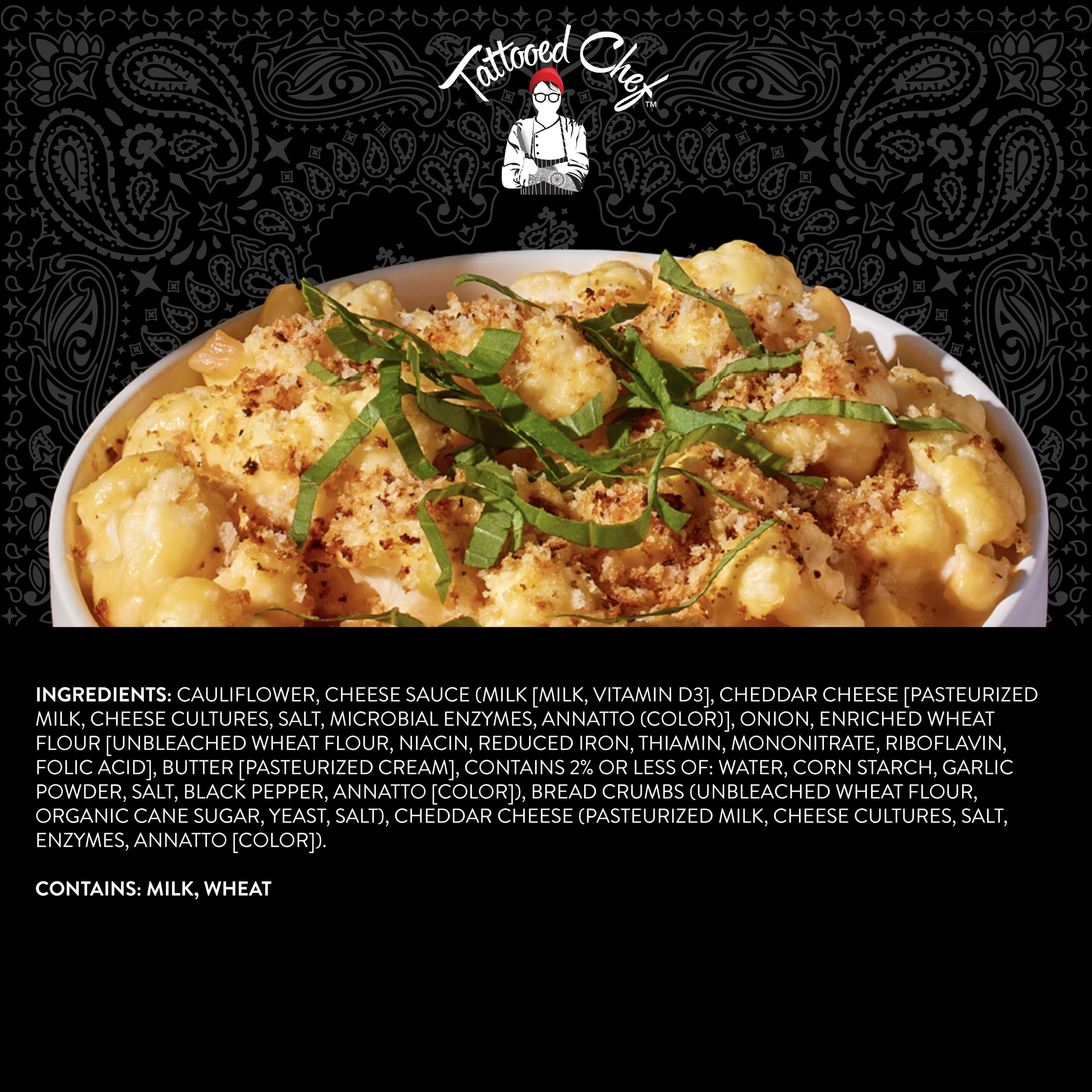At Tattooed Chef, we start with plants then infuse incredible flavor to create an entree bowl that’s convenient and life-changing delicious. Go for your favorites then try something new! Our Cauliflower Mac & Cheese Bowl is 10oz of creamy cheddar cheese sauce over cauliflower florets topped with panko bread crumbs.