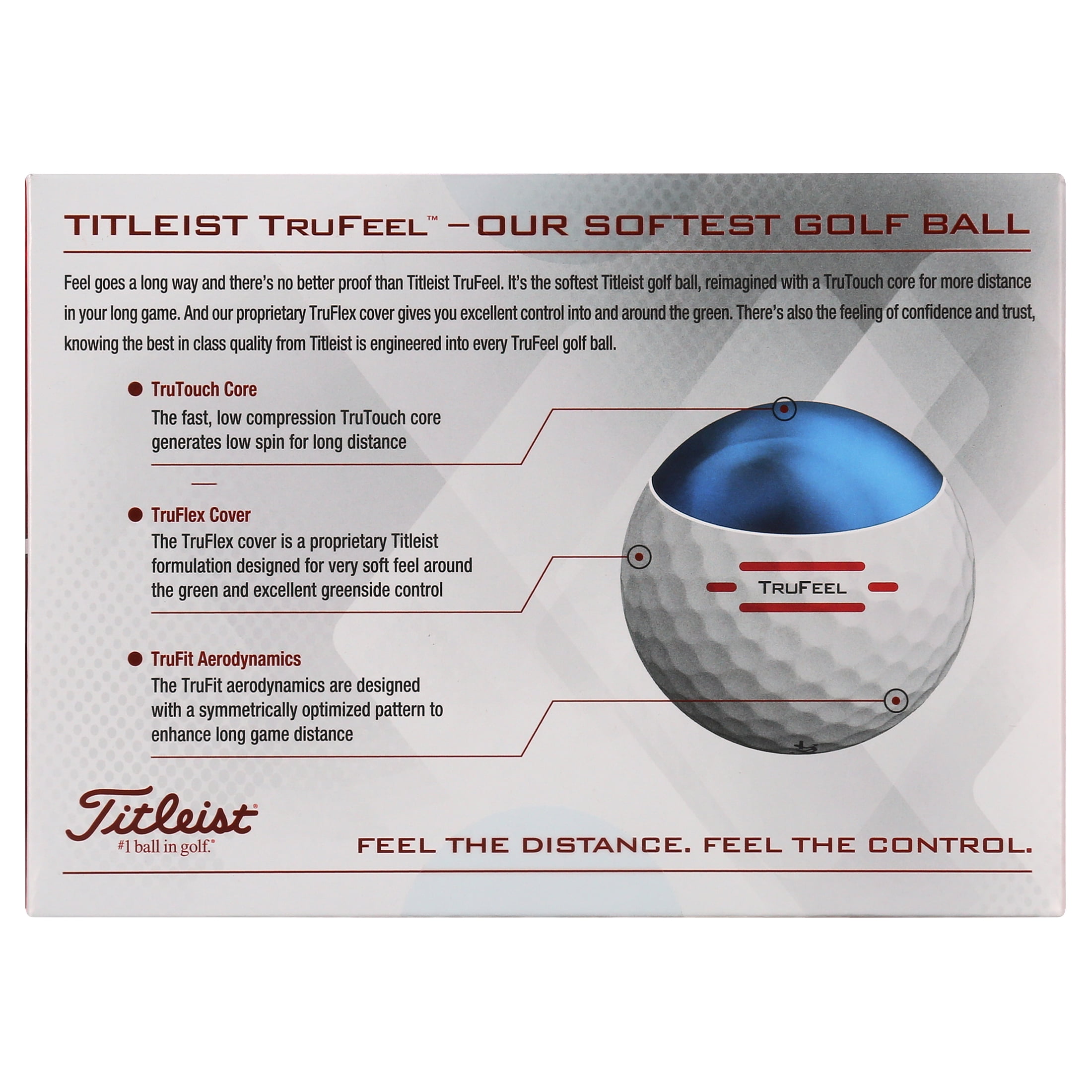 Experience the feel of distance and control with the Titleist TruFeel Golf Balls. Redesigned with a new core and a new cover, the TruFeel delivers longer distance on all shots. It?s the softest feeling Titleist and provides superior distance through low spin on long shots and increases short game spin for stopping power on the green. At Titleist, R&D specifically designed TruFeel to be soft and ? just as important ? provide best in class performance for your game.