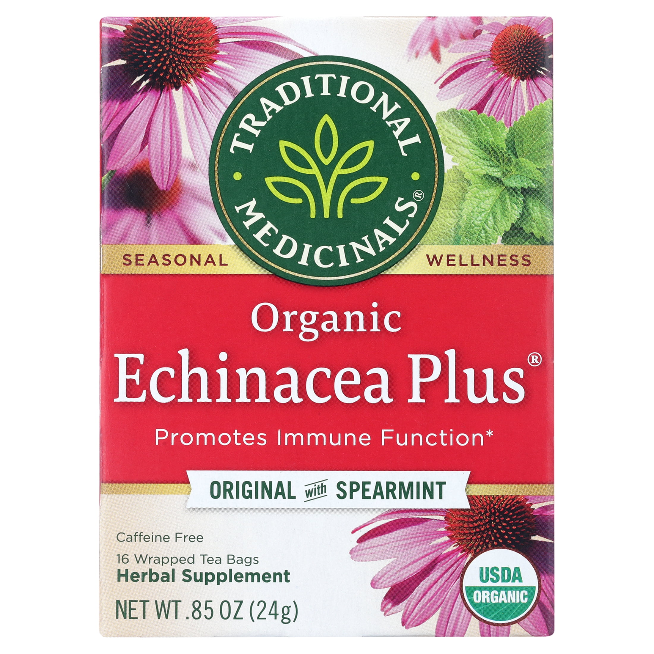 Traditional Medicinals Organic Echinacea Plus Herbal Tea Bags 16 Ct. Native American tribes have been using echinacea, or purple coneflower, for hundreds of years before it made its way into Western herbalism. Today, it is one of the most widely studied herbs for its ability to promote a healthy immune response.* Have some on hand for when you need a boost of wellness. From field to cup, we make sure our teas deliver the benefits of these amazing plants. To deliver consistently high-quality teas, we source organically farmed or organically wild-collected herbs from ethical trading partnerships, seeking out medicinal-grade plants. Only a small fraction of the world’s herb supply meets our high-quality standards.