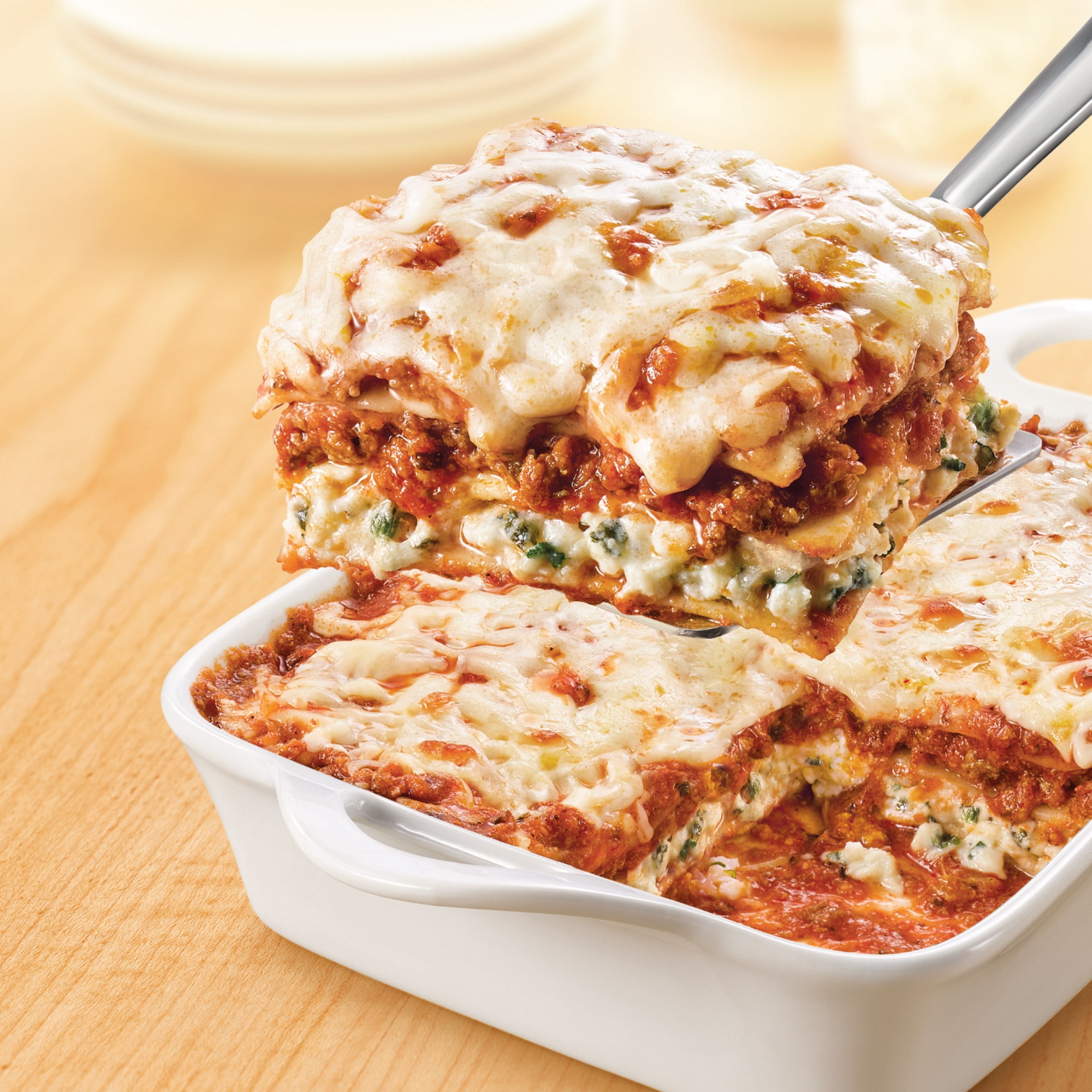- Gluten free pasta is layered with mozzarella and ricotta cheeses, beef and a classic red sauce