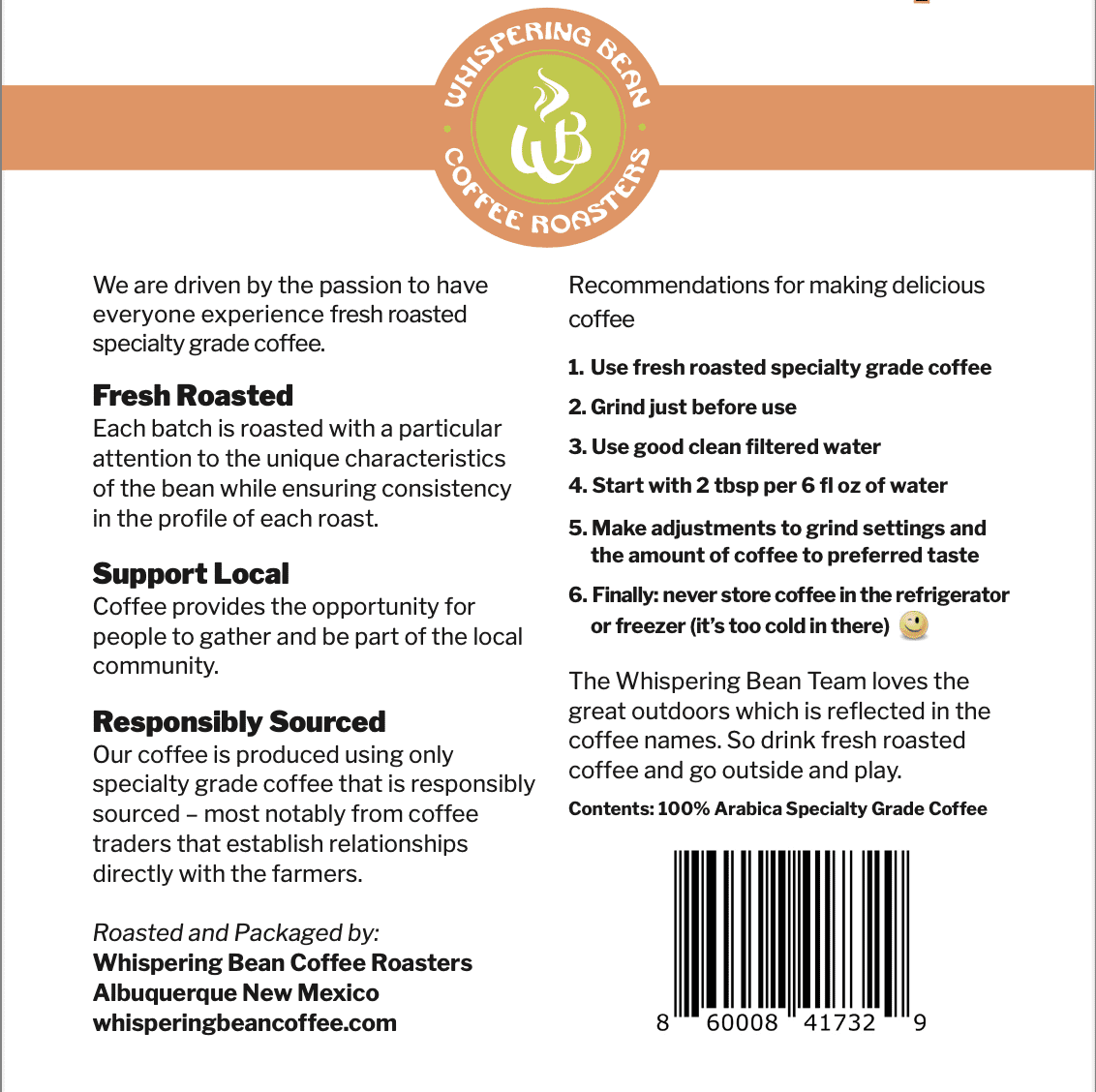 Whispering Bean Coffee Roasters was founded in 2014. We are driven by the passion to have everyone experience fresh roasted specialty grade coffee. Each batch is freshly roasted with a particular attention to the unique characteristics of the bean while ensuring consistency in the profile of each roast. Our whole bean coffee provides the opportunity for people to gather and be part of the local community. Our coffee is produced using only specialty grade coffee that is responsibly sourced – most notably from coffee traders that establish relationships directly with the farmers. The Bean Whispers Hints of Flavor and the Cup Tells All… The Whispering Bean Team loves the great outdoors which is reflected in the coffee names. So drink fresh roasted coffee and go outside and play.
