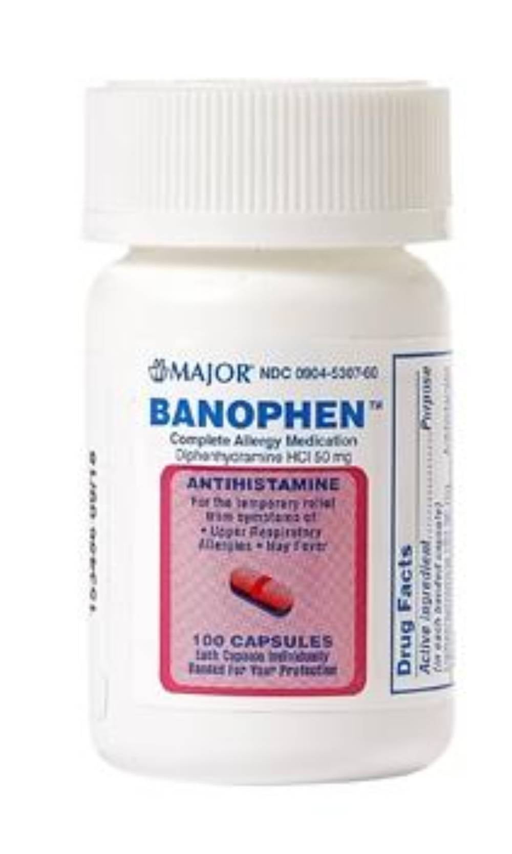 Major Banophen Antihistamine Diphenhydramine HCl Allergy Medication, 50 mg Caplet, 100/Bottle