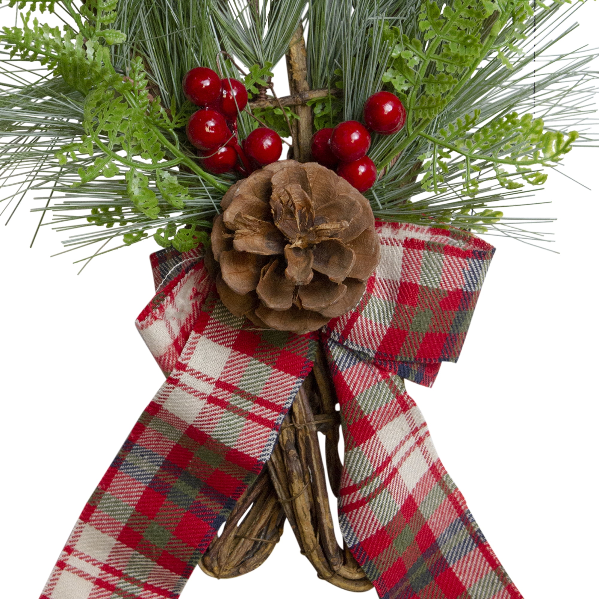 This pair of snowshoes would be the perfect addition to your already existing Christmas decor. Hang on any wall or any door in your home for the holidays. . Product Features: Grapevine snowshoe wall decor. Green and red plaid bow accent with berries and cedar. Come ready to hang from jute rope. Recommended for indoor use only. Dimensions: 20"H x 12"W x 3"D. Material(s): wood
