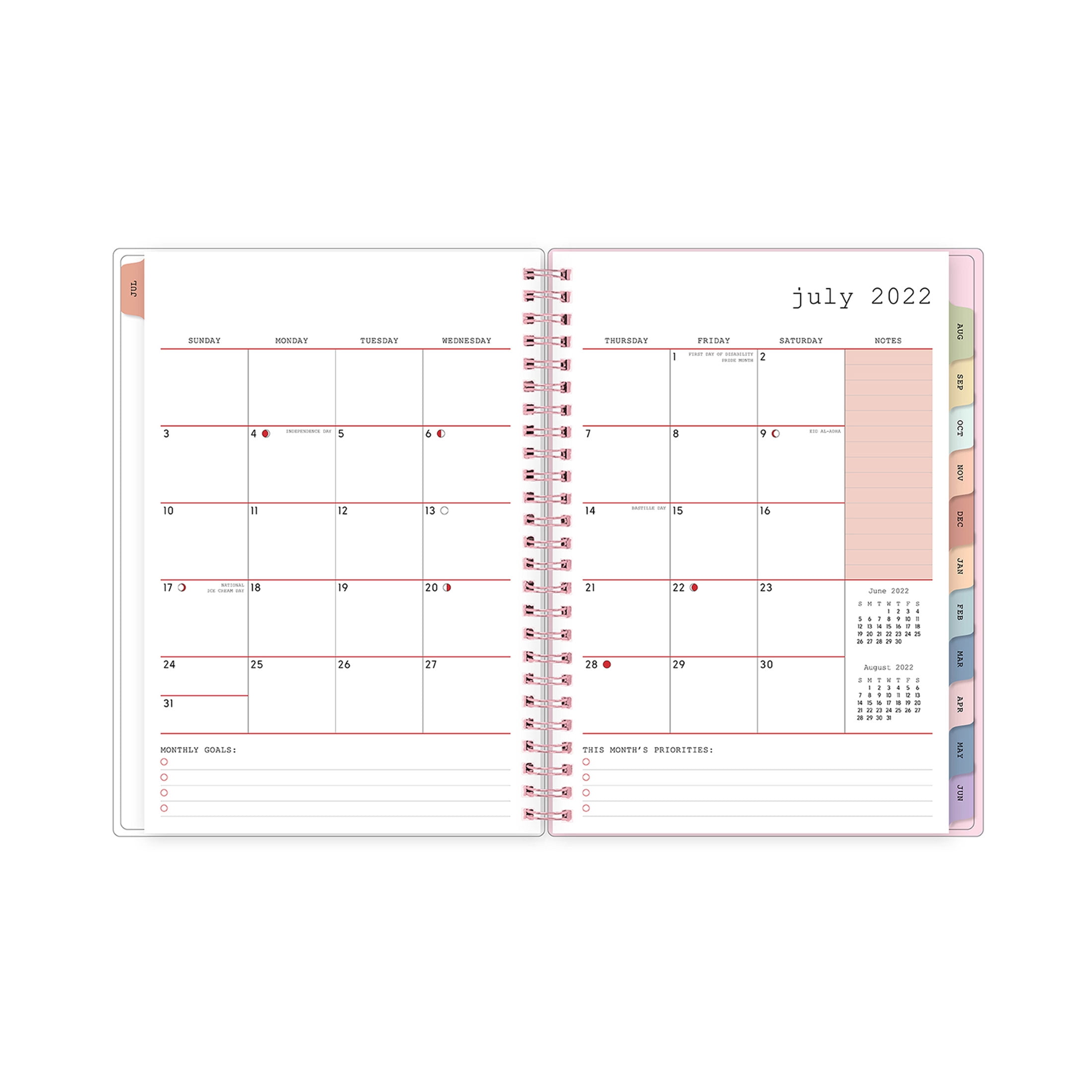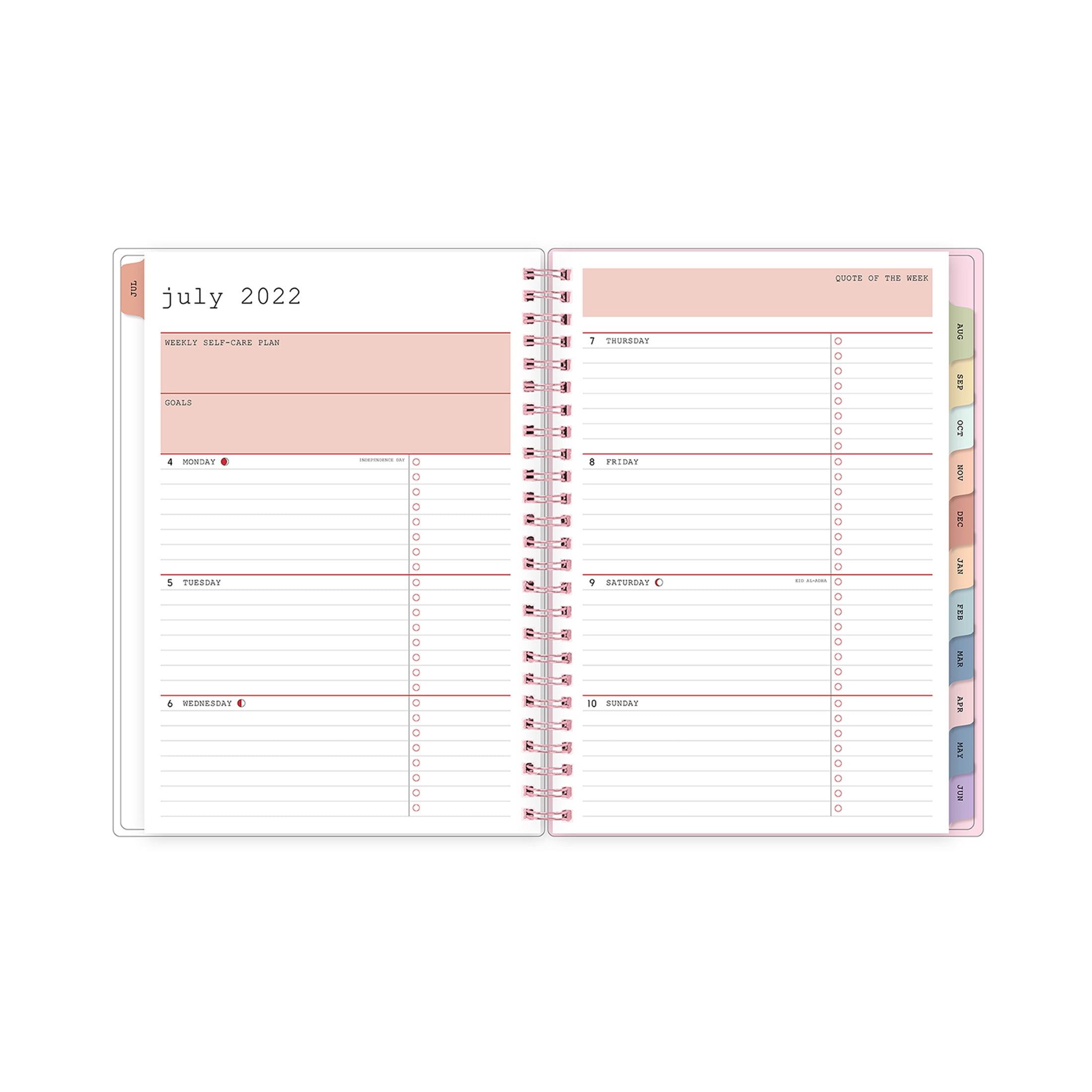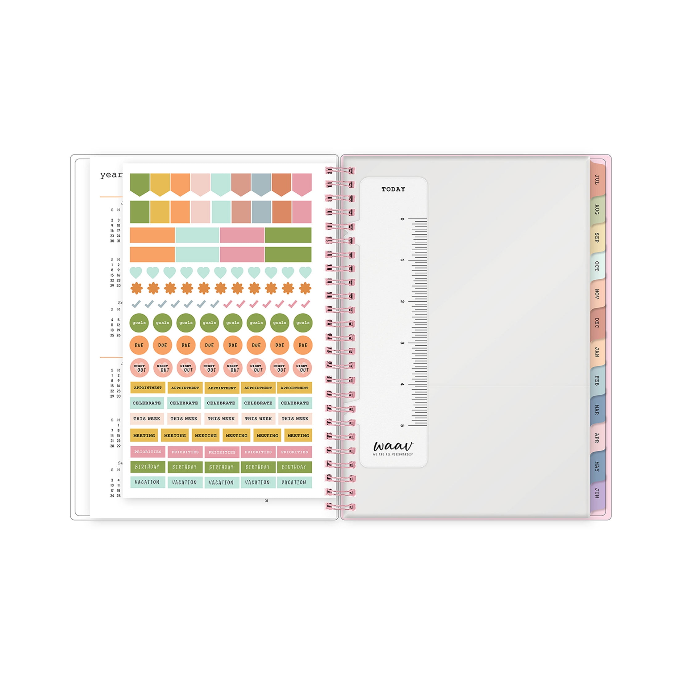 - 12 months of weekly views and tabbed monthly calendars