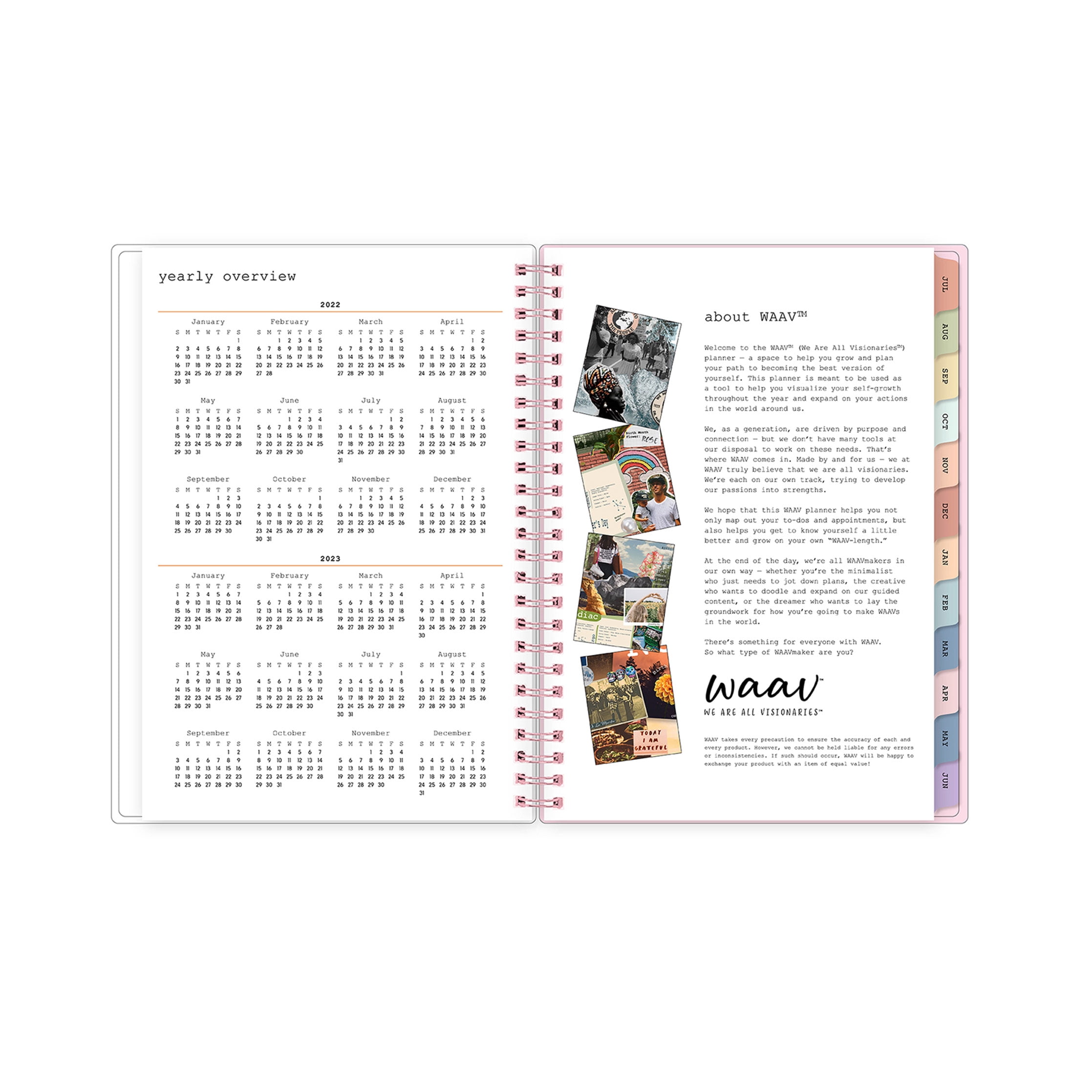 Looking for a planner with more writing space? The WAAV planner notes is for you! In addition to traditional weekly/monthly layouts, this academic planner has 21 lined pages for notes. Every aspect of the planner notes was thoughtfully constructed, from providing a platform for up-and-coming Gen Z artists to share their art, to sourcing the best eco-friendly materials. Monthly content and coordinating themes provide inclusion, education, and recognition within the diverse community of WAAV makers around the world. WAAV (We Are All Visionaries) believes in conscious planning, so each planner notes includes a storage pocket, stickers, and a snap-in bookmark, as well as designated areas for self-care, goals, and quotes that inspire or empower you throughout the school year. Flexible cover features the Reese pink floral pattern, and the super thick, recycled paper provides less bleed-through when you use saturated pens and markers. Dated July 2022 to June 2023.