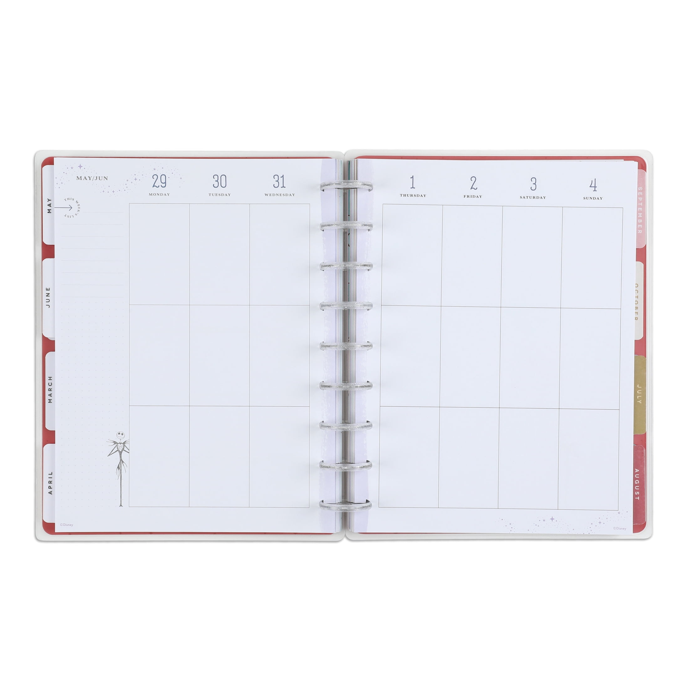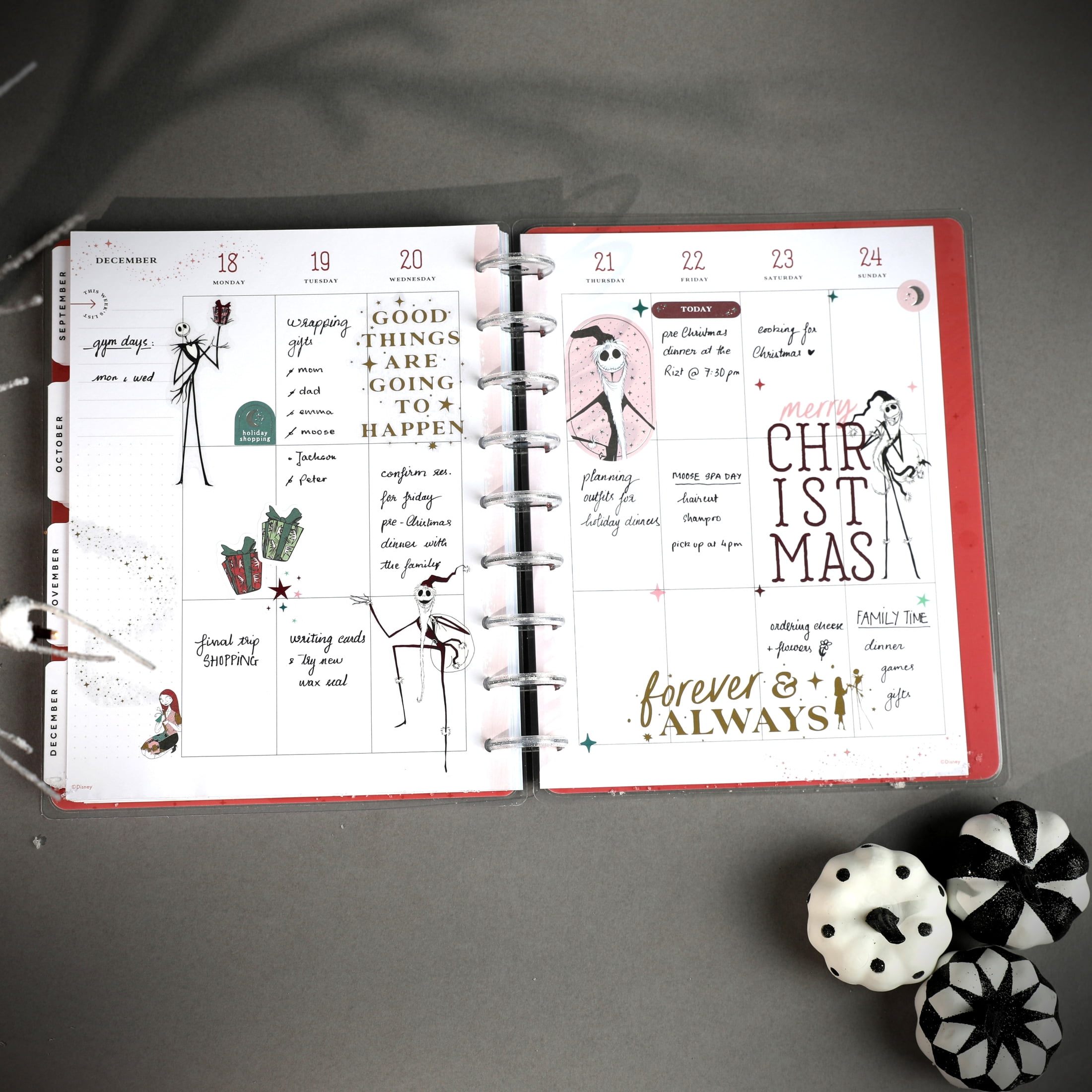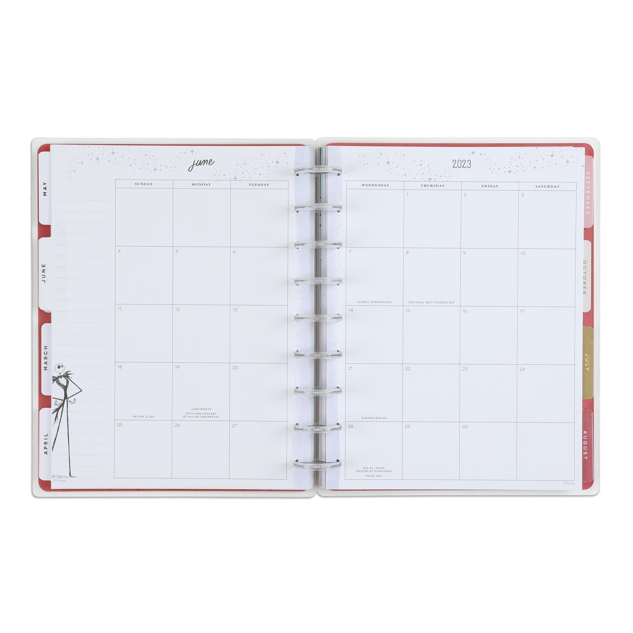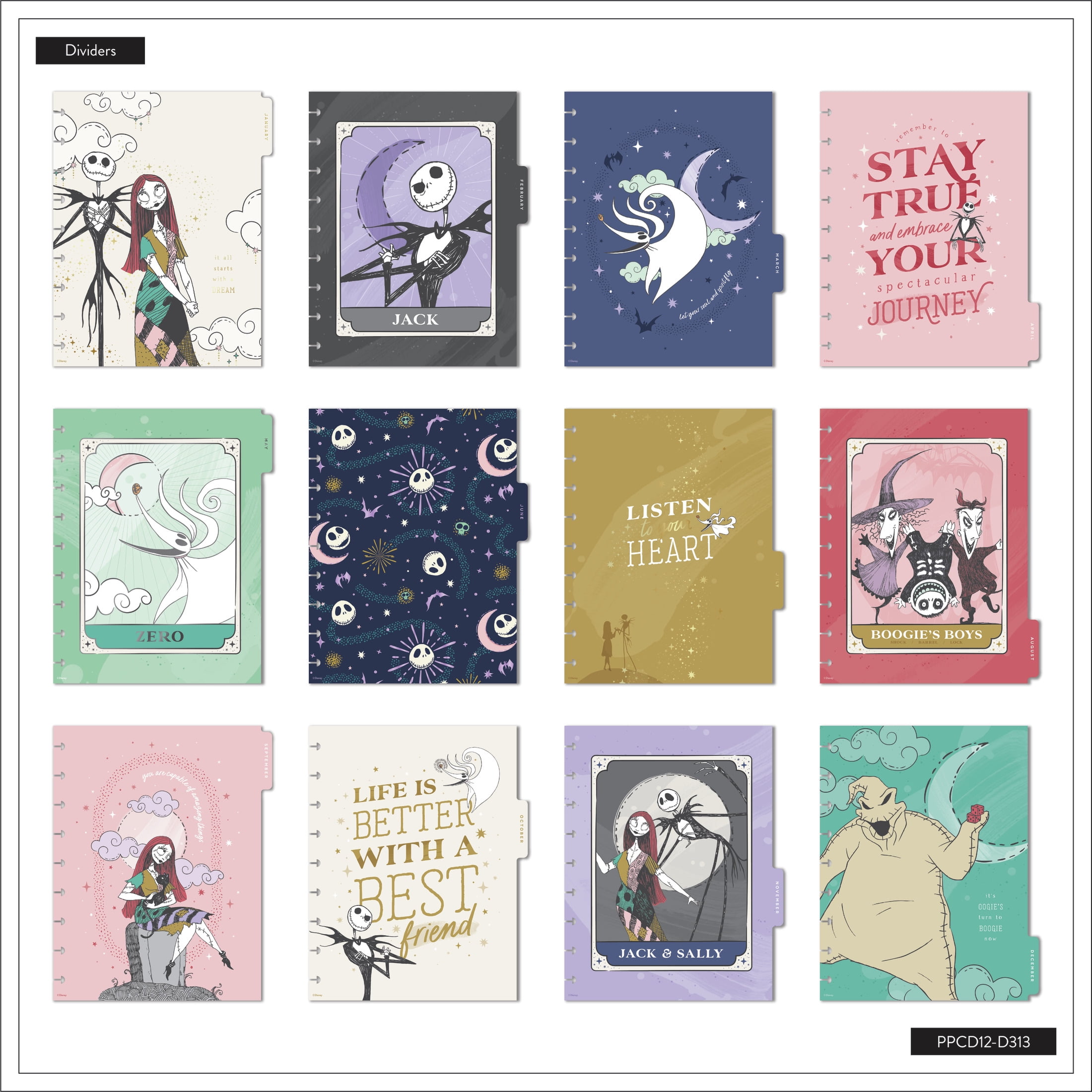 - Dated 12-month planner runs from January 2023 – December 2023 with 12 dividers featuring colorful designs featuring Nightmare Before Christmas characters.