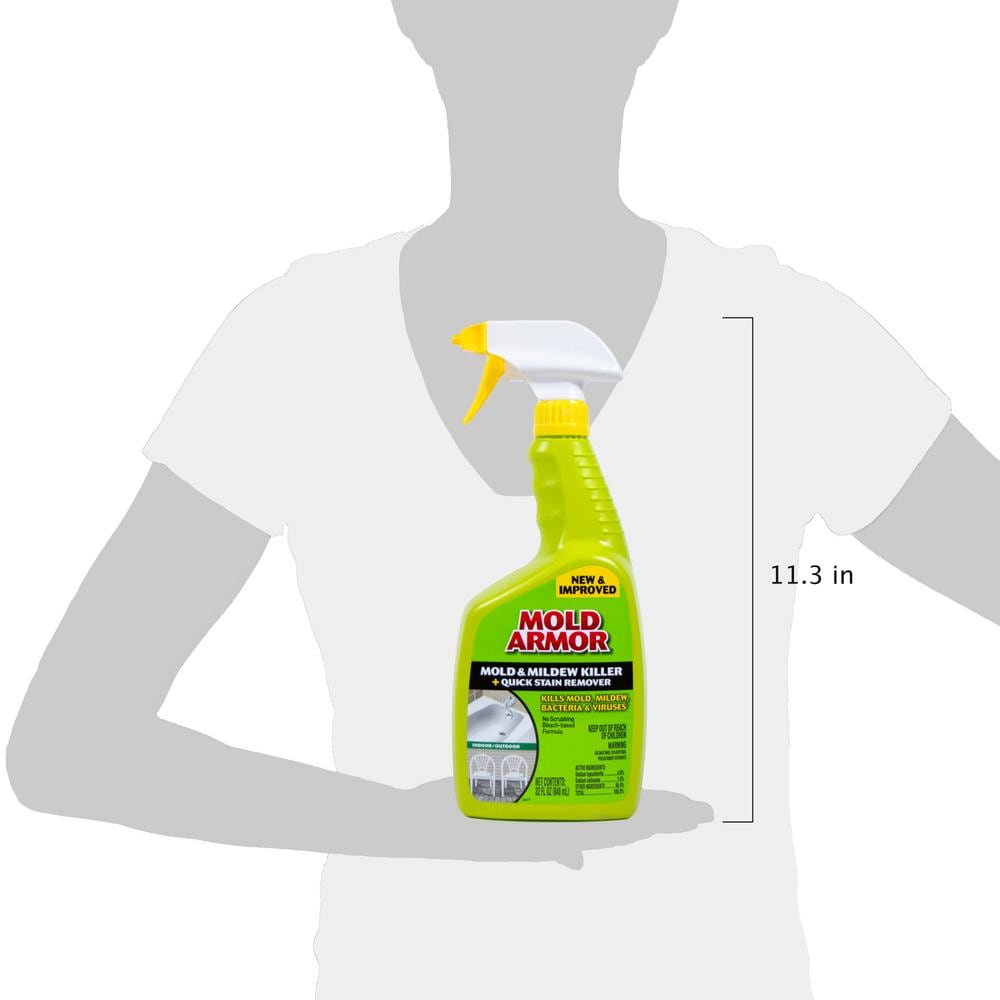 Mold Armor Mold and Mildew Killer plus Quick Stain Remover kills mold and mildew in one application. Not just a typical bathroom cleaner, this mold remover spray works wonders on non-porous surfaces including bathtubs, shower doors, toilet seats, countertops, sinks, sealed grout, vinyl, garbage cans, plastic surfaces, sealed fiberglass, sealed granite, glazed porcelain tile, glazed ceramic tile, laminate, Formica and linoleum.