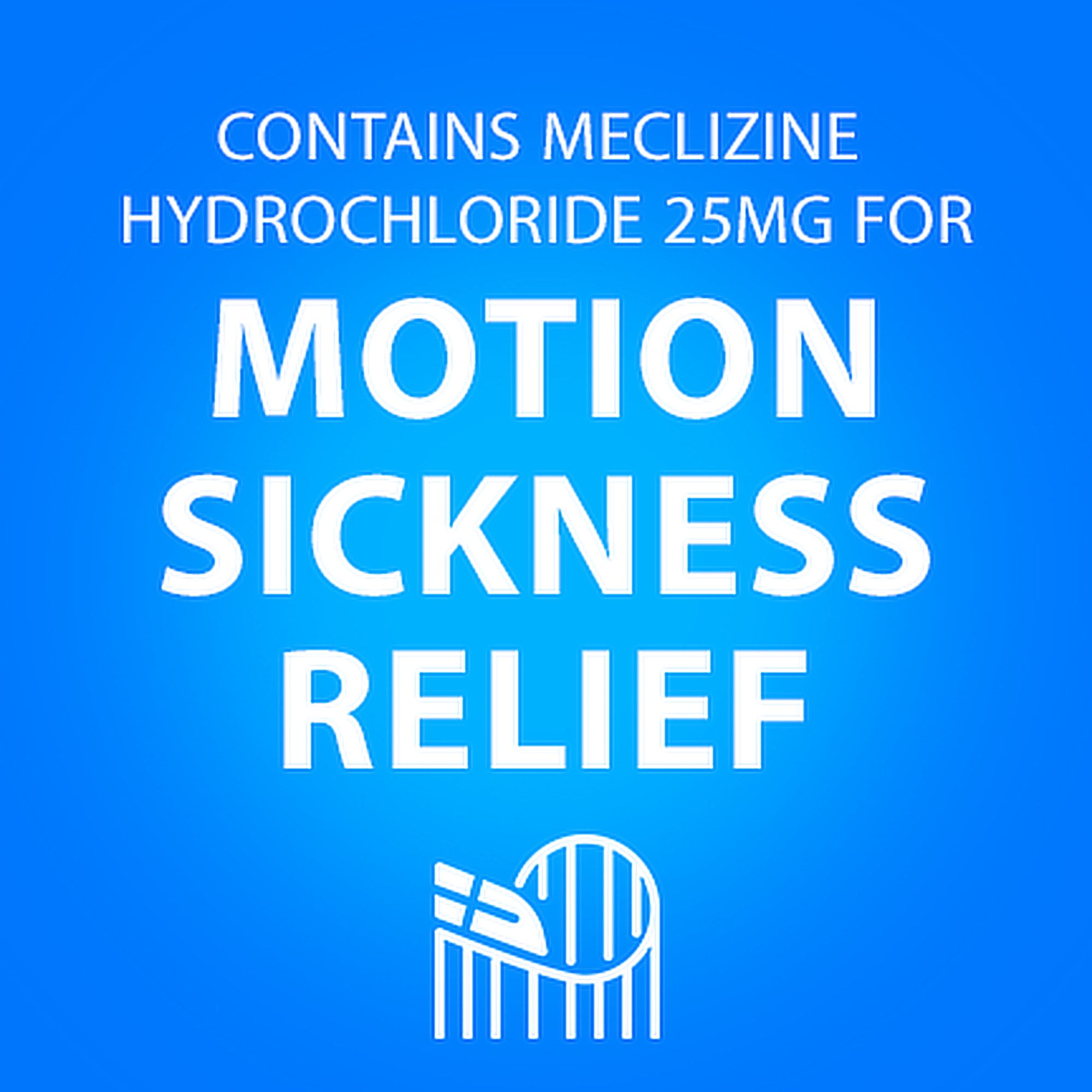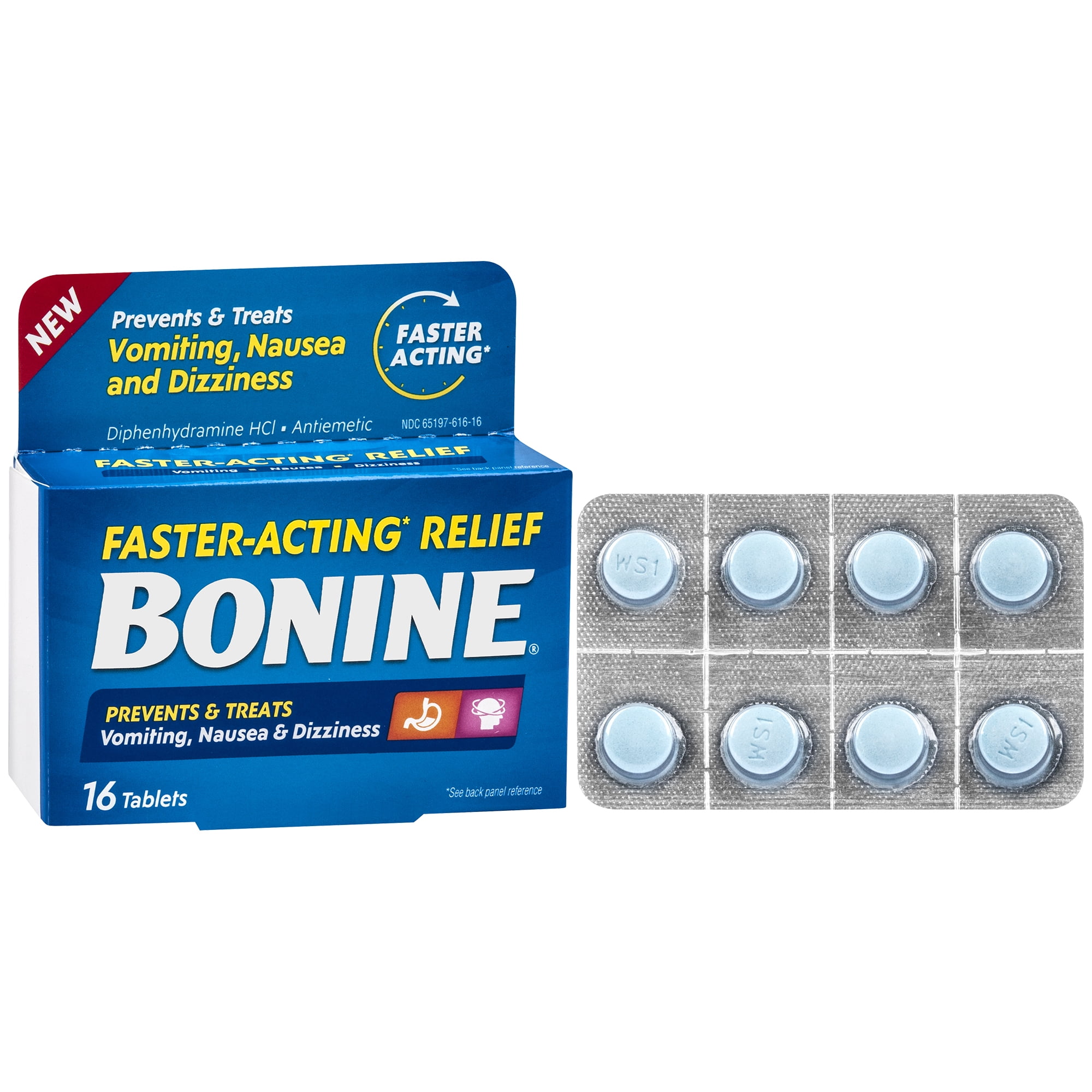 BONINE® TABLETS: A chewable once daily tablet for adults that helps prevent and treat nausea, vomiting or dizziness associated with motion sickness. Take Bonine® Tablets one hour before travel for 24 hours of motion sickness relief. This fruity raspberry tablet is just what your travel medicine kit is missing. Find nausea relief in an easy chewable form, with less drowsiness than other leading brands of antiemetic tablets. Just about anyone can get motion sickness. Kids ages 2-12 get it very easily, while infants and toddlers seem relatively immune. But for everyone else, riding in a car, boat, train or plane can bring on unsettling feelings of nausea and dizziness.Taking Bonine® right before you travel can help keep motion sickness at bay. Count of 8 tablets per package.