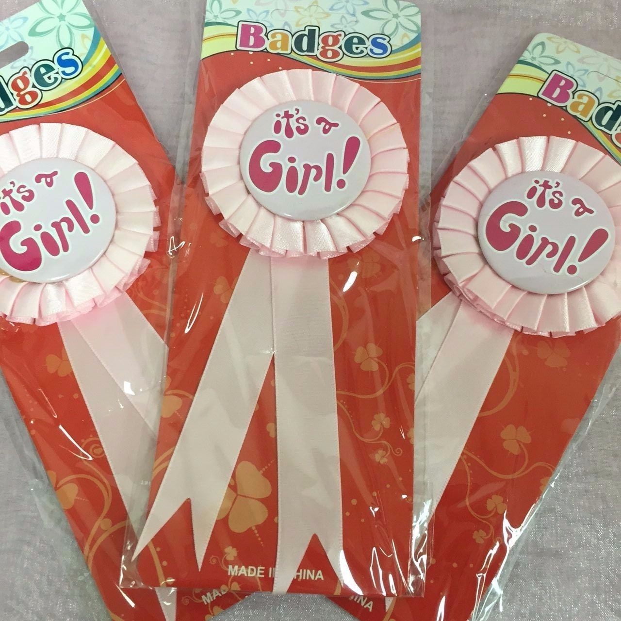 LOT OF 6 PIECES PINK BABY SHOWER CORSAGE. "IT’S A GIRL" METAL BUTTON MEASURES 1 1/2" IN DIAMETER. CORSAGE IS MEASURE 1 3/4" X 6 3/4". RUFFLE AROUND THE METAL BUTTON AND RIBBON ARE POLYESTER. GREAT FOR YOUR BABY SHOWER!