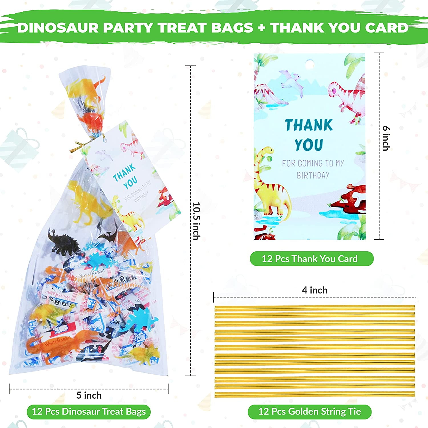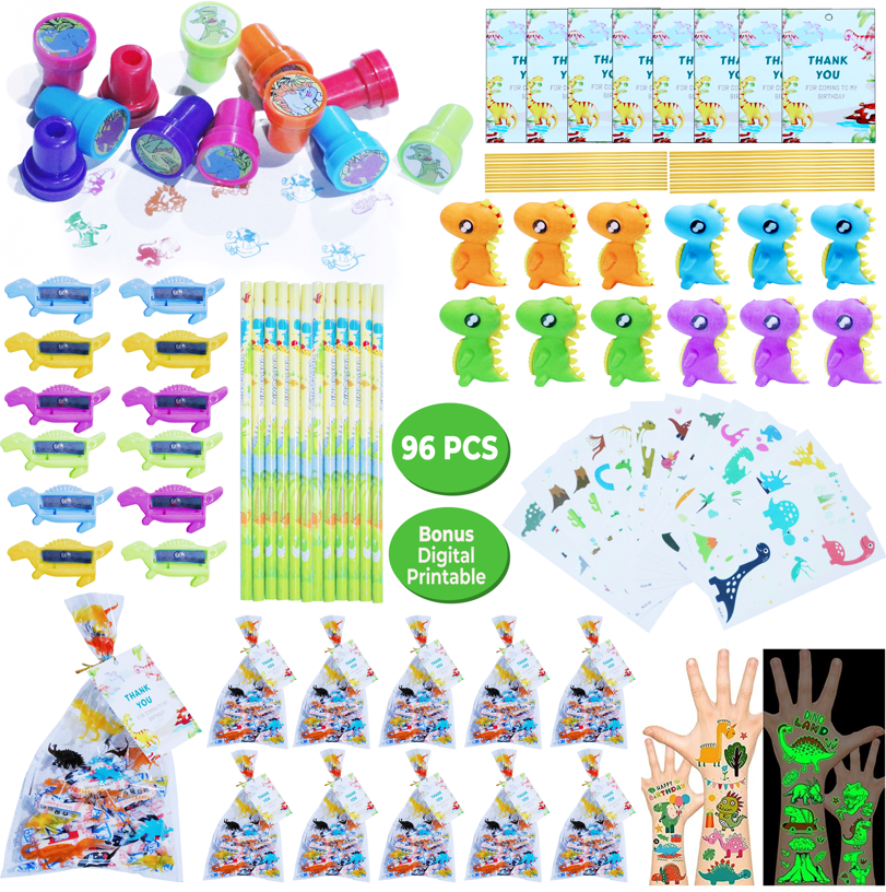 - That’s a total of 96 Pcs of Dino favors, you can divide these small gifts into 12 pieces to serve 12 guests. Every child will be very happy to receive these cute little gifts, order them now and bring a memorable Dinosaur themed party for your kids!!