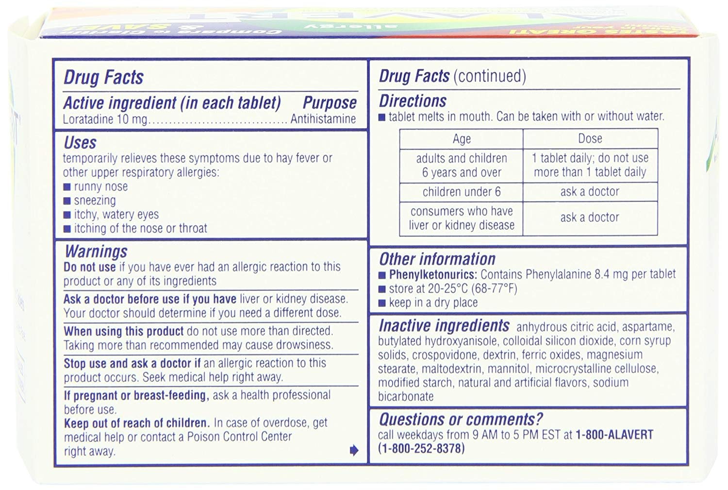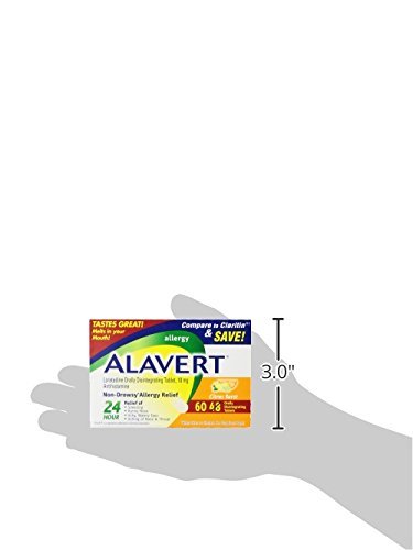Experience the relief of Alavert Allergy 24 Hour Orally Disintegrating Tablets. Delivers 24 full hours of symptom relief, sneezing, runny nose, itchy, watery eyes and itching of the nose and throat in a single orally disintegrating tablets. Alavert is conveniently Experience the relief of Alavert Allergy 24 Hour Orally Disintegrating Tablets. Delivers 24 hours of symptom relief, sneezing, runny nose, itchy, watery eyes and itching of the nose and throat in a single orally disintegrating tablet. Alavert is conveniently available over-the-counter without a doctor’s prescription so you can get back to your day and leave your indoor and outdoor allergy symptoms behind. May be used by adults and children 6+. Use as directed.Product Description Get fast-acting relief from even the strongest seasonal allergies. Alavert tablets dissolve on your tongue to deliver 24 hours of antihistamines to your system. Non-drowsy formula provides an effective ingredient for itchy & watery eyes, sneezing, runny nose, and itchy nose and throat symptoms. Alavert tablets are convenient, easy to use dissolving tablet. The medicine is approved for seasonal allergy sufferers as young as six years old.