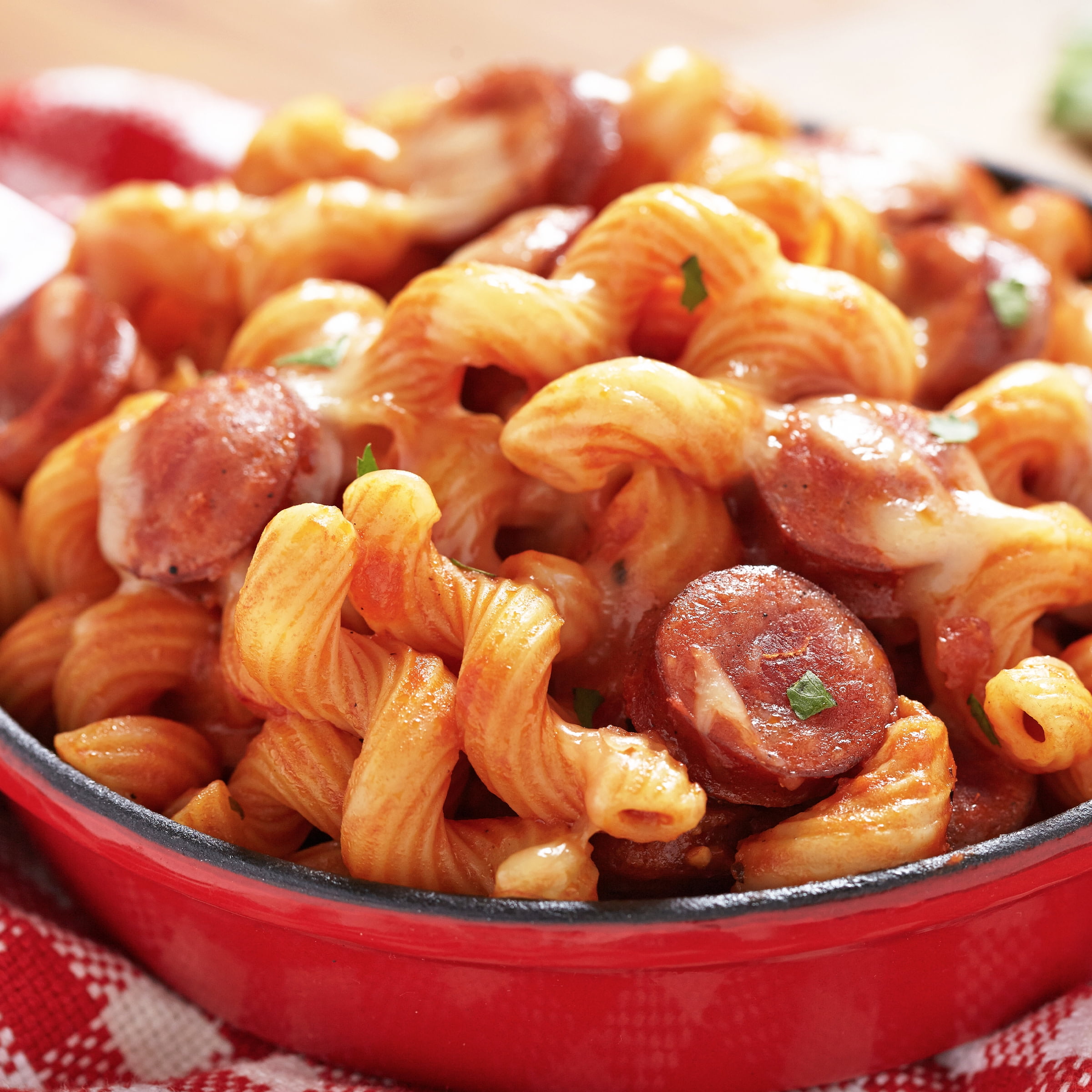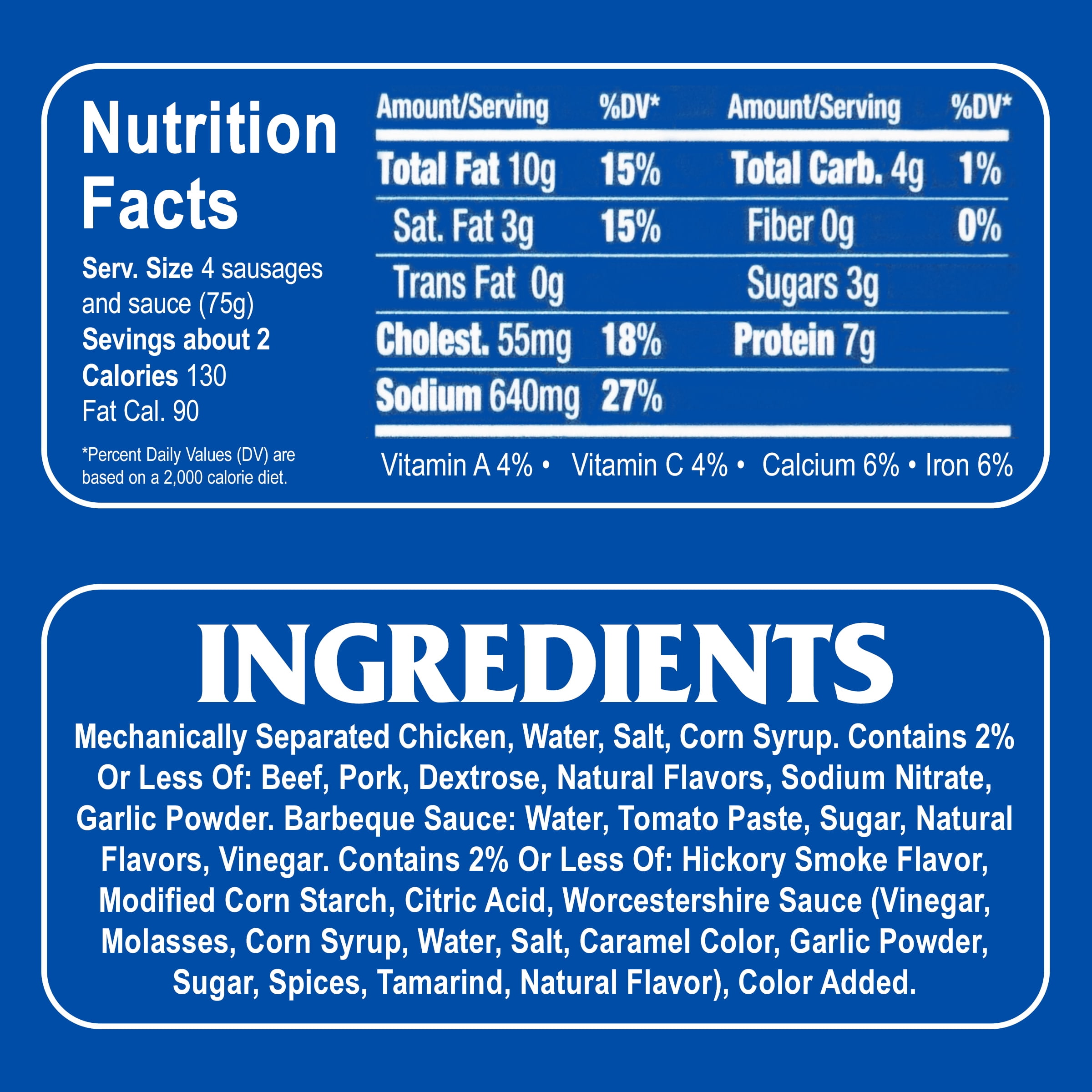 - Chicken sausage with beef and pork added and a tangy barbecue sauce