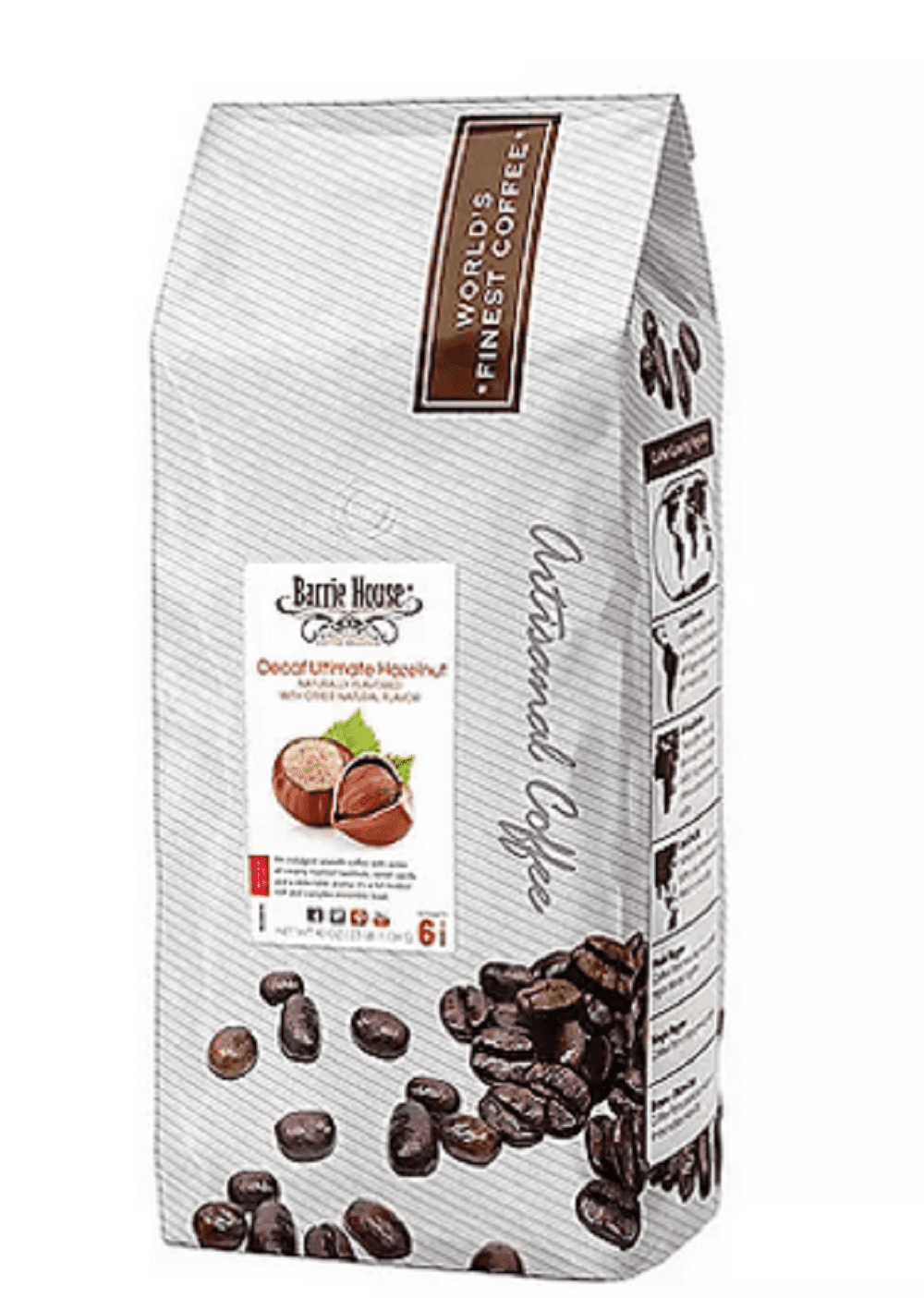 - Barrie House Decaffeinated Ultimate Hazelnut uses 100% Arabica coffee beans