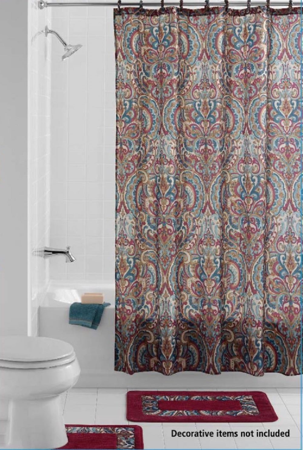 Bath Rug Accessories Set: 2 Burgundy Red Bathroom Mats, 1 Matching Shower Curtain, 12 Fabric Rings- Sicily