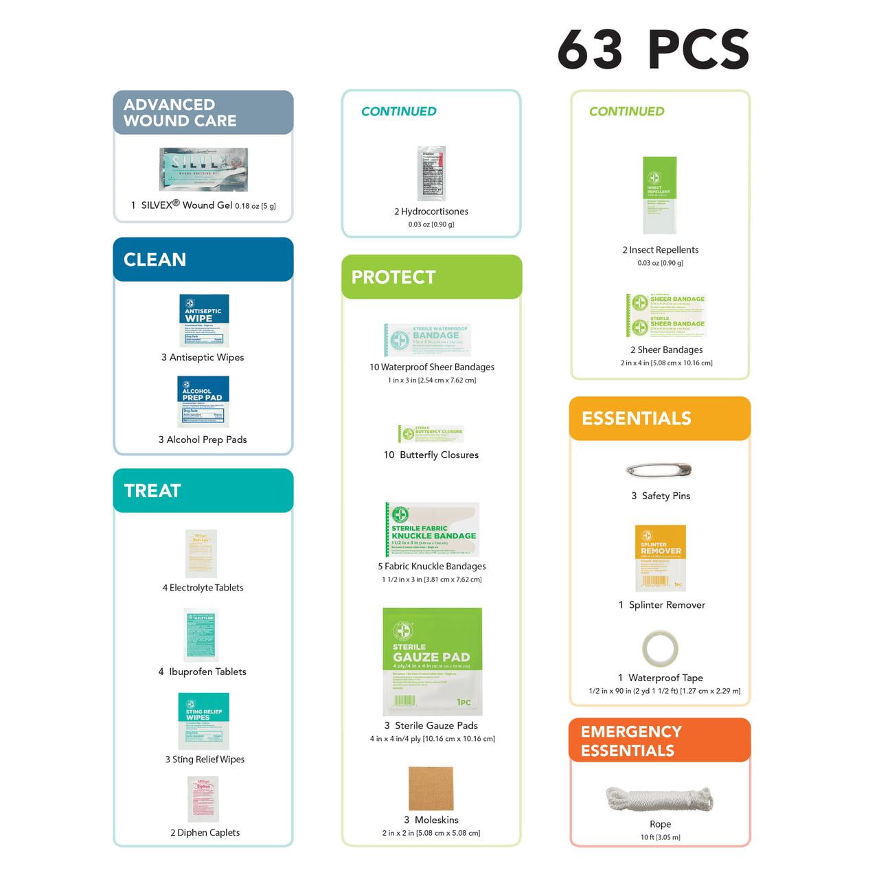 • WE GOT YOU COVERED: Provides treatments for allergies, insect bites and stings, 1st and 2nd degree burns, headaches, minor aches and pains, and more with 63 pieces of comprehensive first aid treatment products
