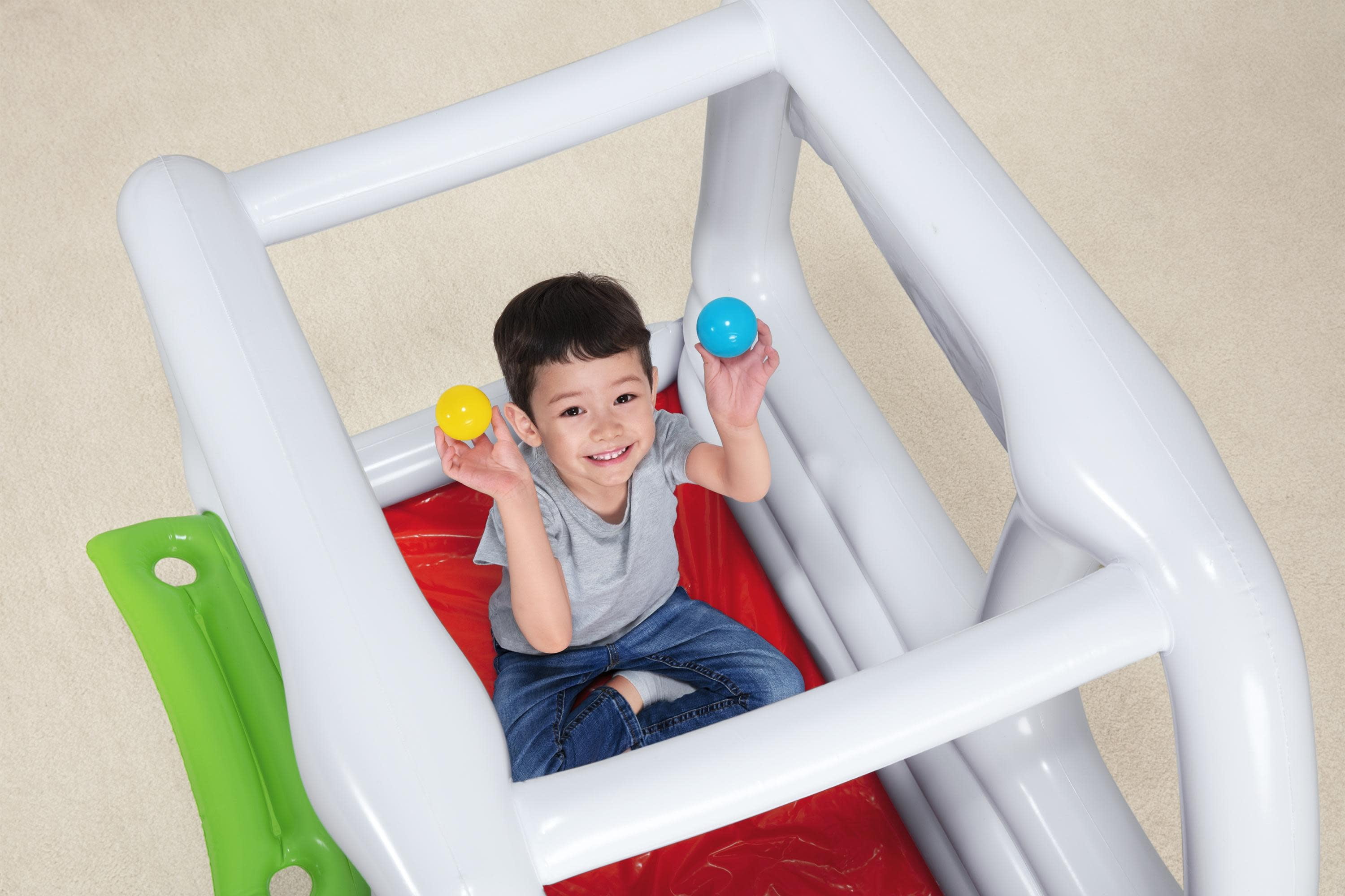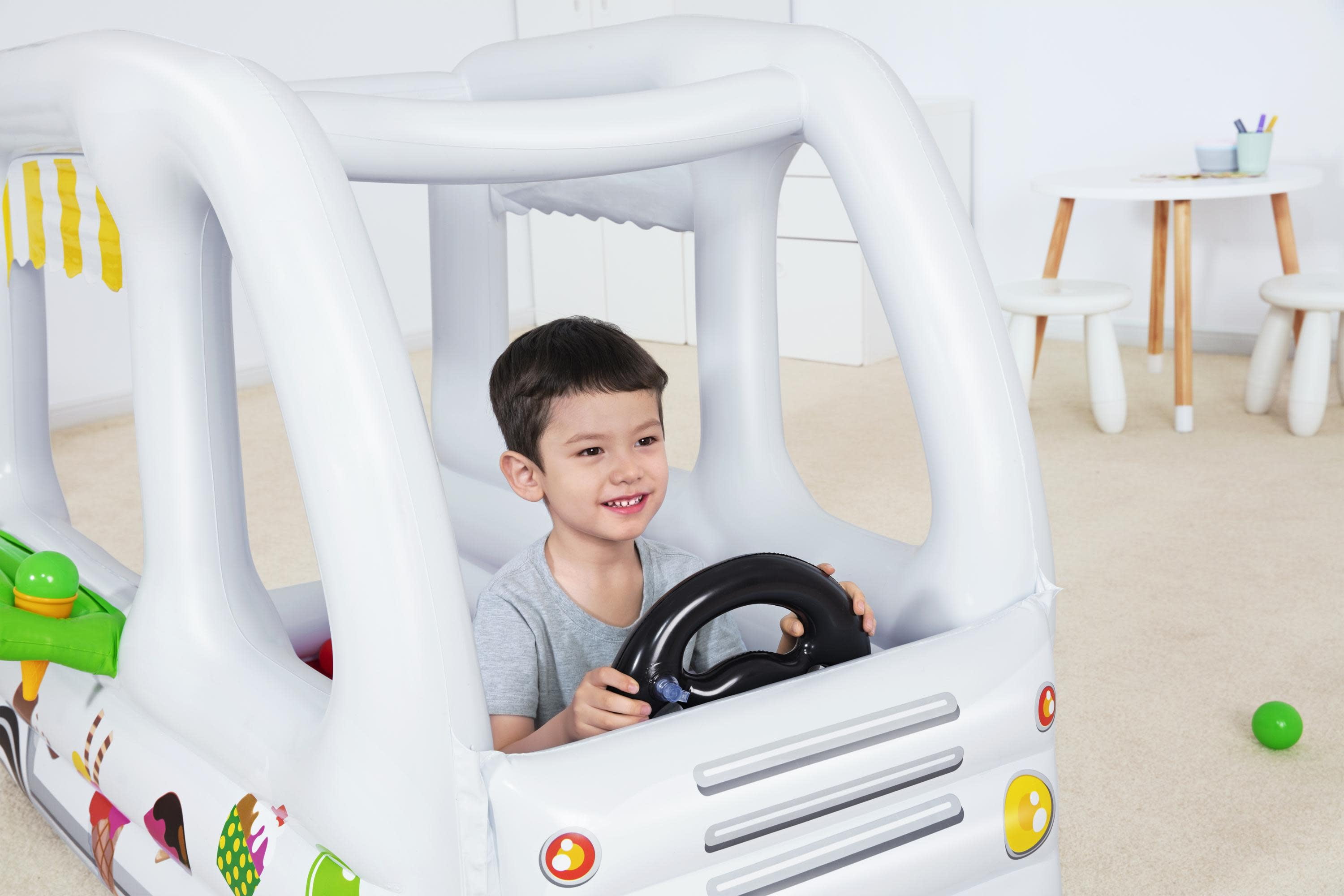 The Bestway® Scoops ‘N Smiles Ice Cream Truck Ball Pit is a versatile toy for inspiring hours of make-believe fun. This enclosed ball pit looks just like a kid-sized version of the real thing. An open space in the back of the truck provides a spot for your child to climb in, while the other three sides feature inflatable walls with windows for looking out. It includes two toy ice cream cones that fit into an attached inflatable tray table that hangs from the ice cream truck’s open window. An inflatable steering wheel is built-in to the front of the truck, making it easy for your child to pretend to drive and deliver ice cream for hours on end. Bright, colorful pictures of ice cream make this toy a fun addition to any playroom.The Scoops ‘N Smiles Ice Cream Truck Ball Pit also comes with ten play balls that can be added to the ball pit for children to roll in or toss and catch. Kids will learn spacial awareness, refine their motor skills, develop hand eye coordination and build confidence as they play.