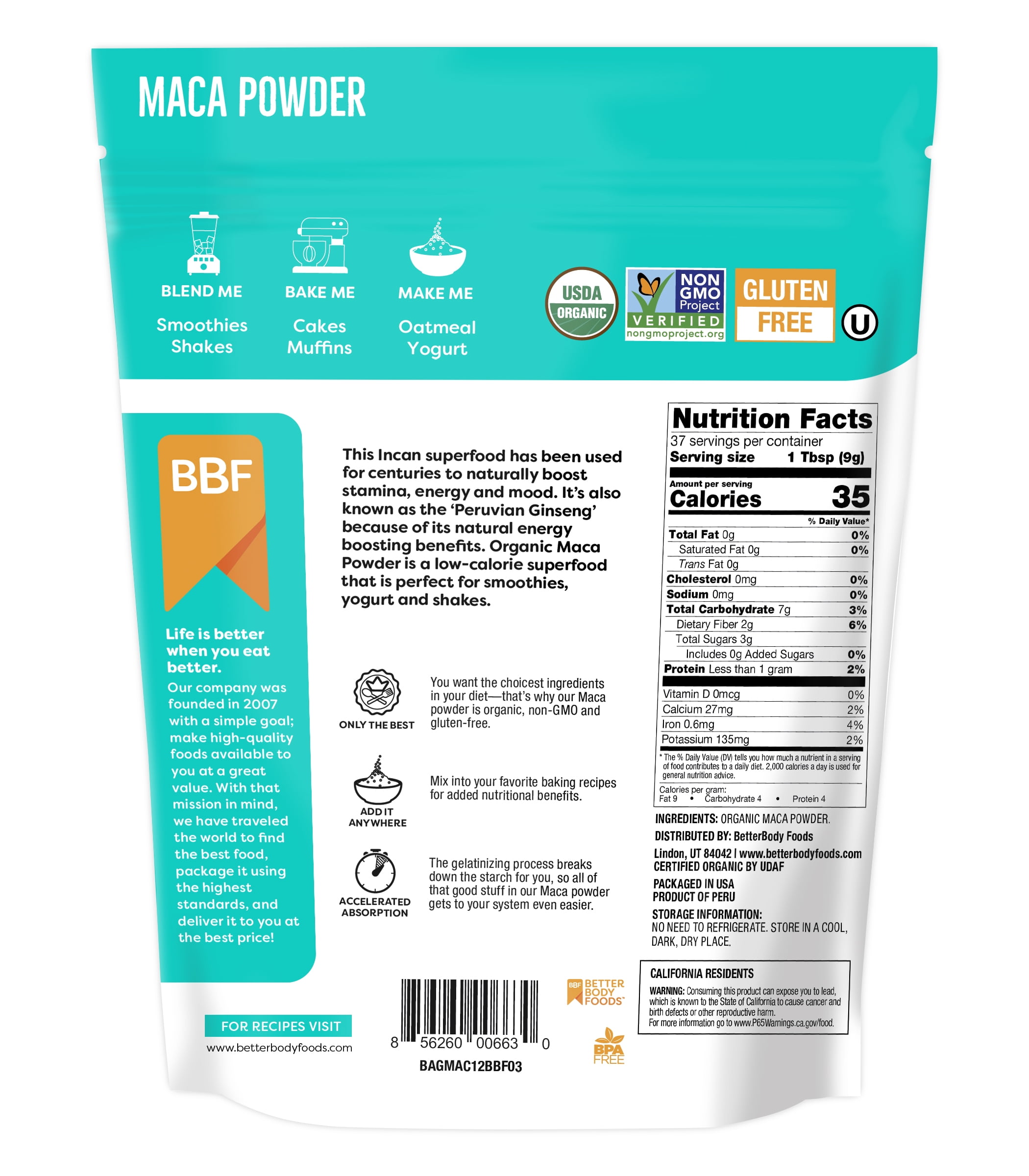 - BetterBody Foods Organic Maca Powder has been used for centuries as an Incan superfood and is a great addition to your pantry!