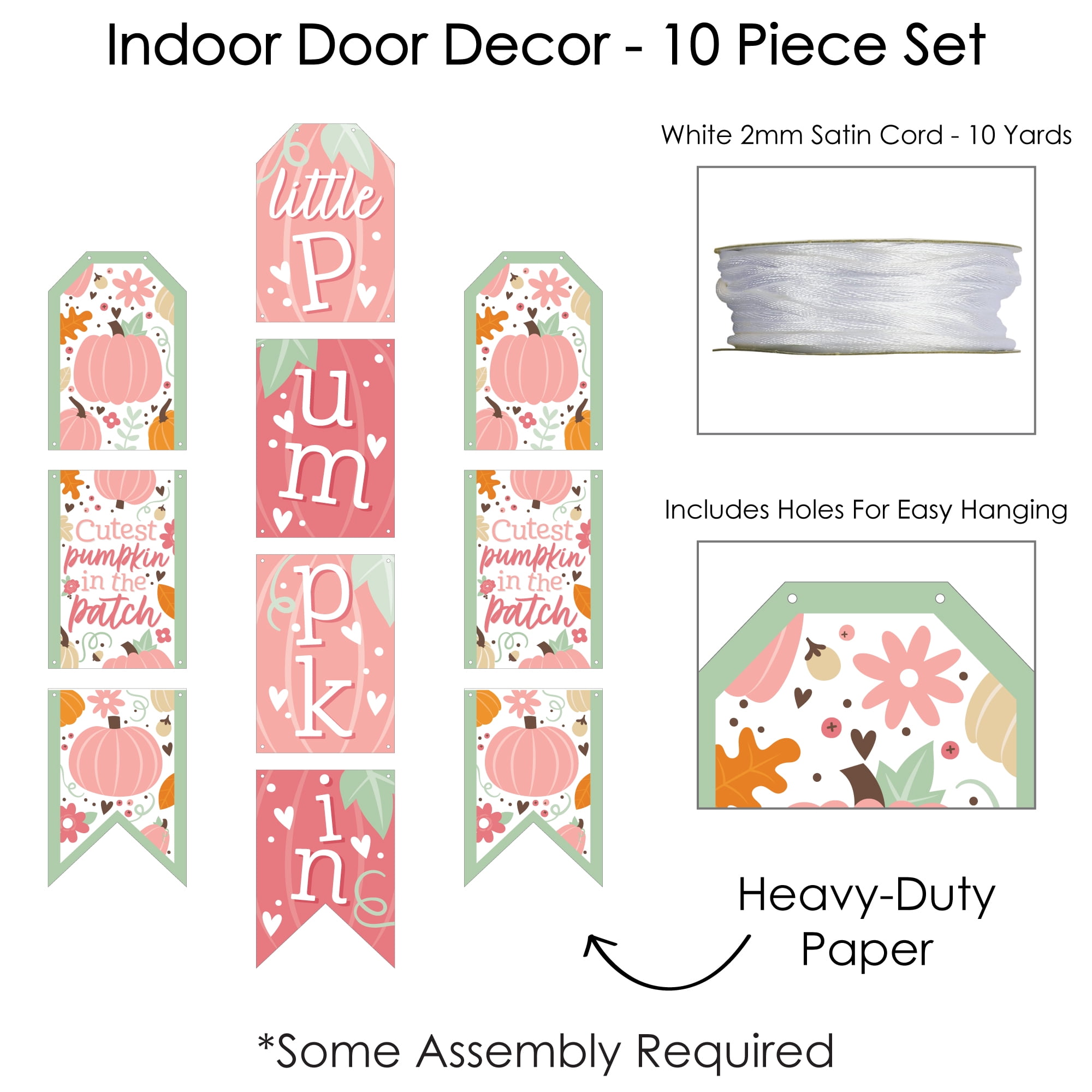 - Big Dot of Happiness Girl Little Pumpkin Indoor Door Decor INCLUDES: 10 heavy-duty paper pieces to create 3 vertical banners and 10 yards white 2mm satin cord. Easy assembly required.