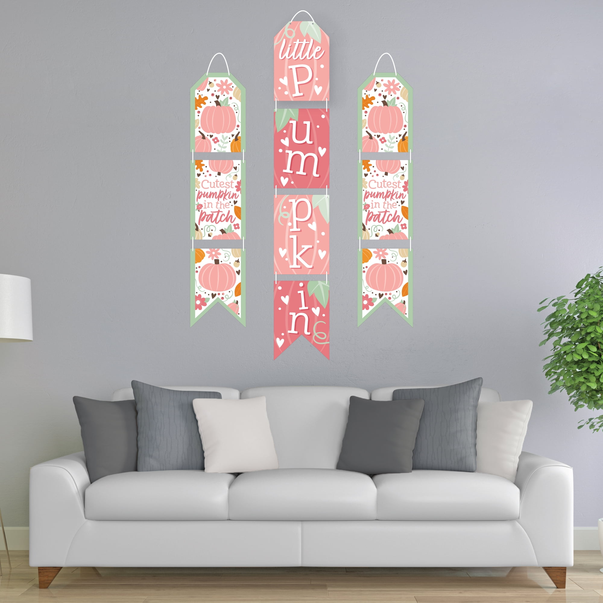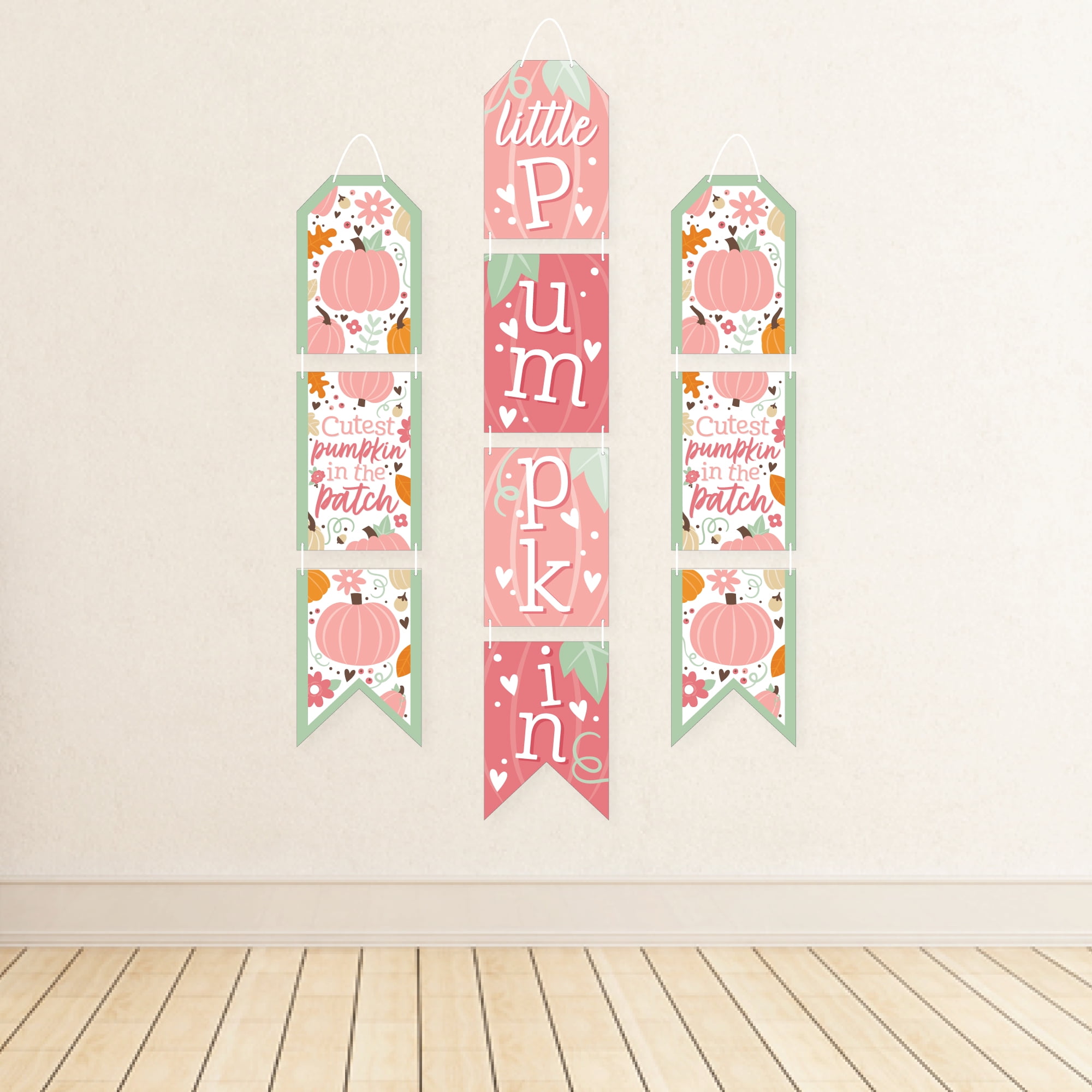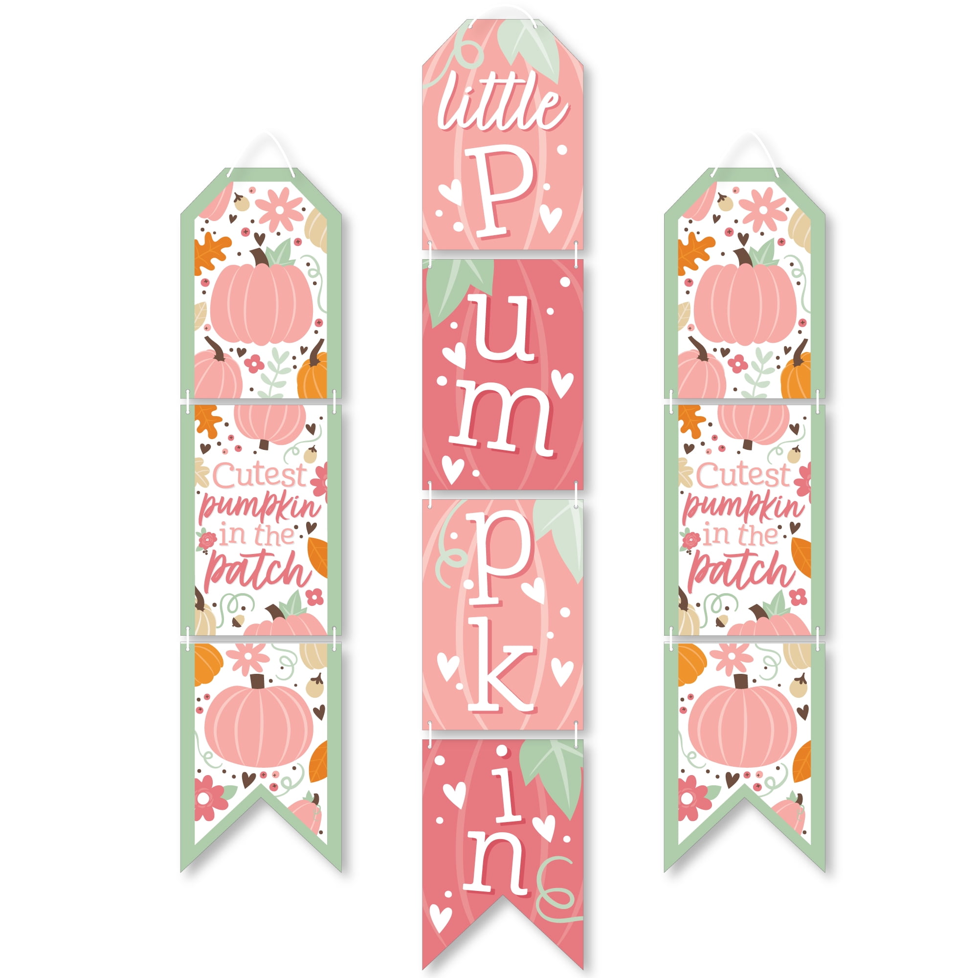 - PREMIUM PARTY SUPPLIES: Girl Little Pumpkin hanging vertical door banner decoration pieces are professionally printed one-sided on heavy-duty cardstock paper. Each banner piece is individually inspected and carefully packaged by hand. Autumn Pink Pumpkin wall decoration kit requires some easy assembly. Follow the number sequence on the back of each banner piece and simply string the included cording through the pre-cut holes.