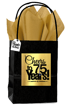 Multi occasion gift favor celebration bags with handles. Includes 12 Bags, 12 Tissues, 12 Thanks for coming Tags. Measures 5-1/2×3-1/4×8-3/8" eachBlack & Gold 75th Birthday / Anniversary Cheers Themed Small Party Favor Gift Bags with Tags -12pack