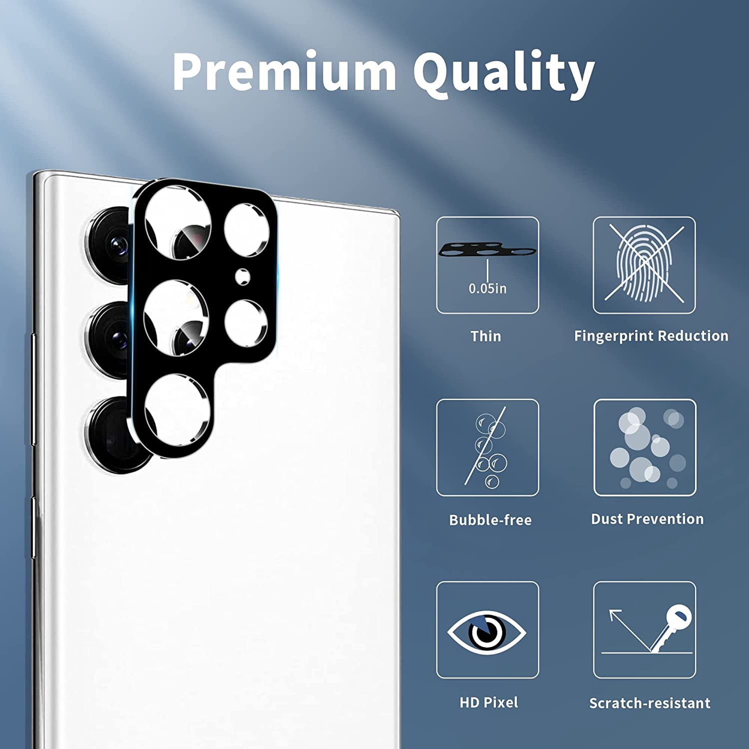 【Compatible Model】This camera lens protector is compatible for Samsung Galaxy S22 Ultra. Include 3 Pack full coverage camera lens protector,which compatible with most phone cases. 【Highly Clarity】99% transparency retain the original screen or picture brightness, keeping your picture or video original quality. 【Anti-Scratch】9H tempered glass camera lens protector protect expensive rear camera lens from scratches and falls.Keep your phone lens clear and clean all the time to hold its value. 【Easy installation】 Remove the dust before installation, and then directly align the lens protector with the hole to install on the camera lens