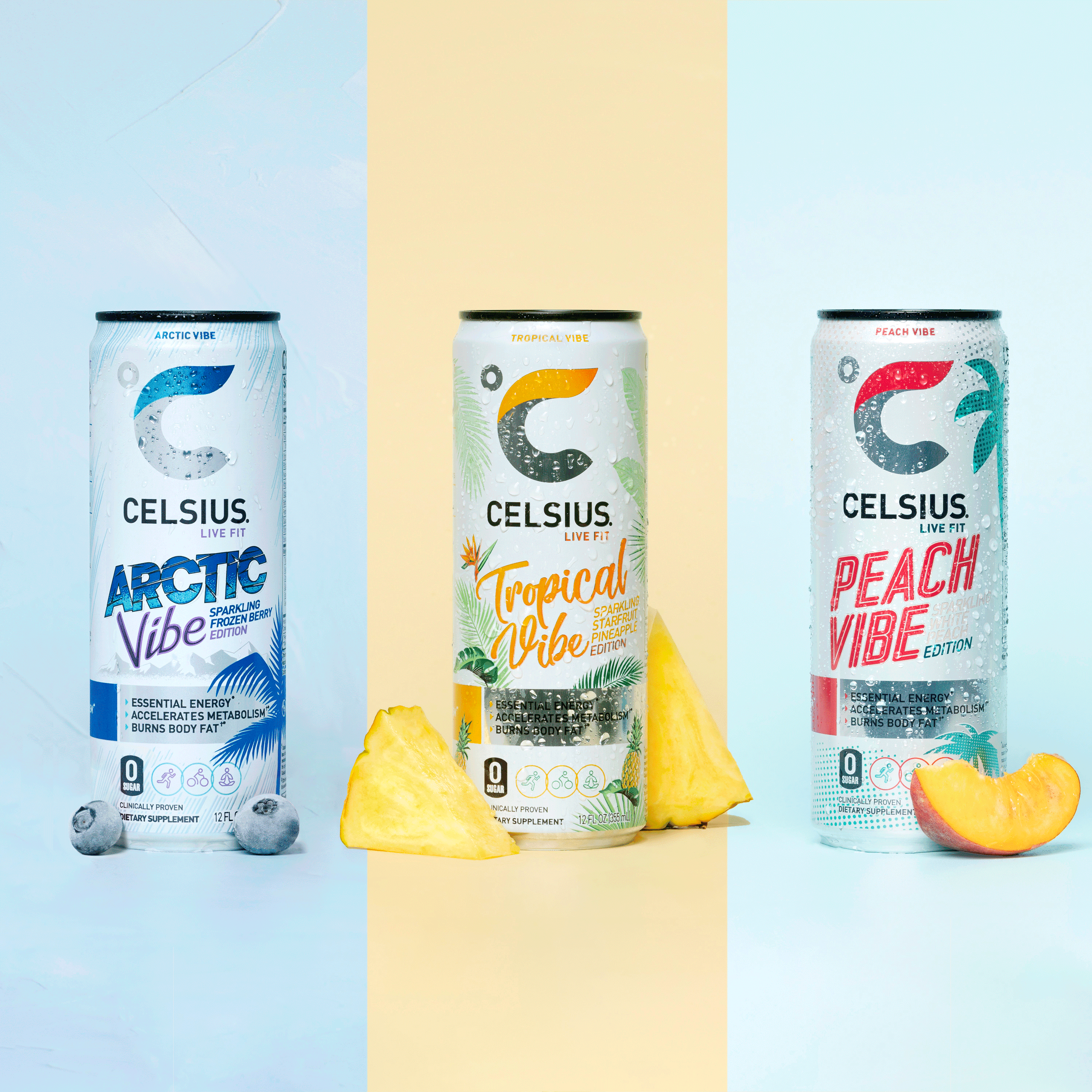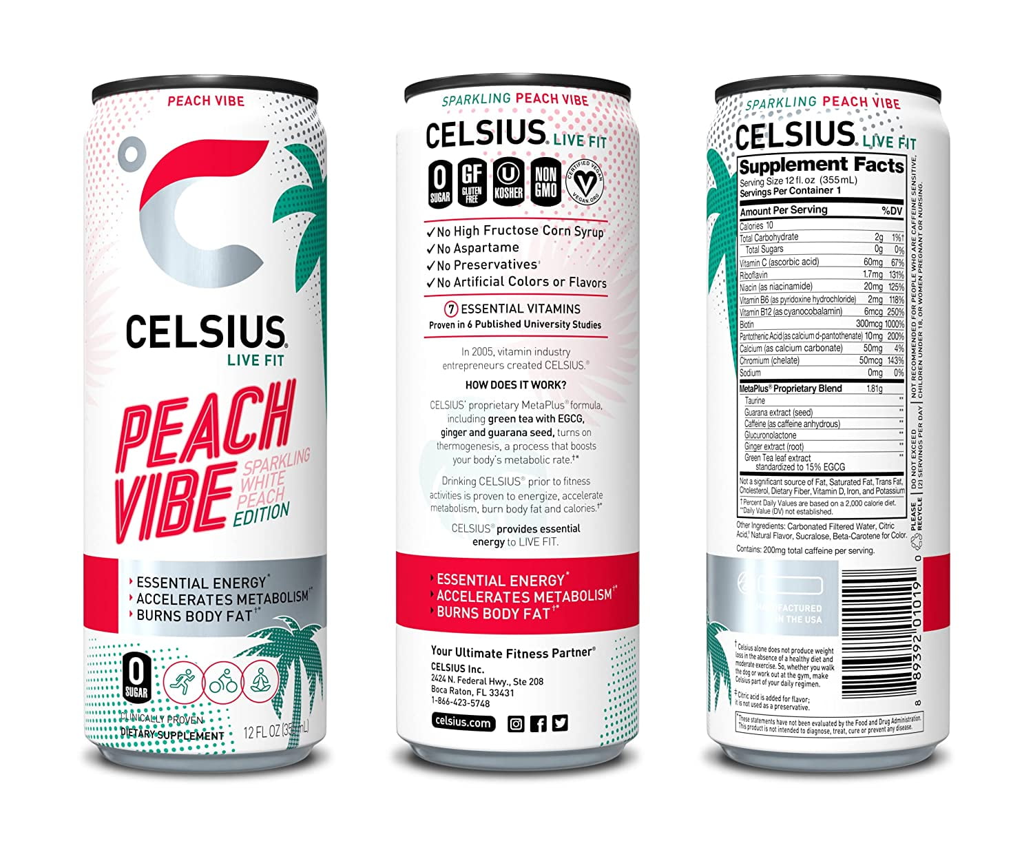 CELSIUS. Live fit. A uniquely blended formula with healthy energy and key vitamins make CELSIUS an ideal pre-workout drink. It’s low in sodium and contains zero sugar, No aspartame, and no artificial flavors, colors, or preservatives. CELSIUS Energy drinks are also certified vegan, Kosher, and non-GMO. Its proprietary formula contains green tea extract and EGCG. It also includes Guarana seed extract, ginger root for flavor and digestion, vitamin C to support your immune system, Vitamin B for energy production, and chromium to help control hunger. Boost your energy and enjoy nothing but good vibes with CELSIUS!