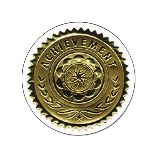 Add the finishing touch to any certificate or award. Foil embossed seals are elegant and the embossed gold and silver foil will make any certificate even more special. Self-adhesive back makes application easy. Die-cut and embossed with the word: "Achievement". Shape: Round Label Size – text: 1.75" dia. Design: Achievement Label Colors: Gold.